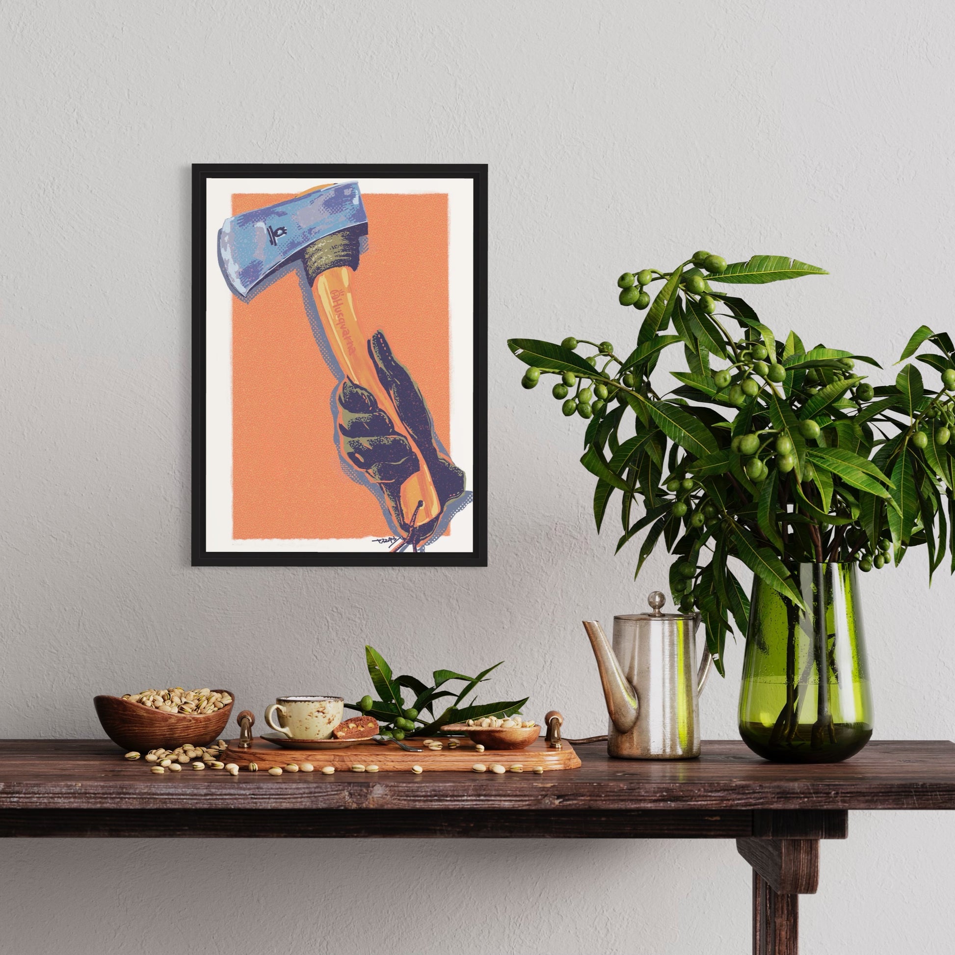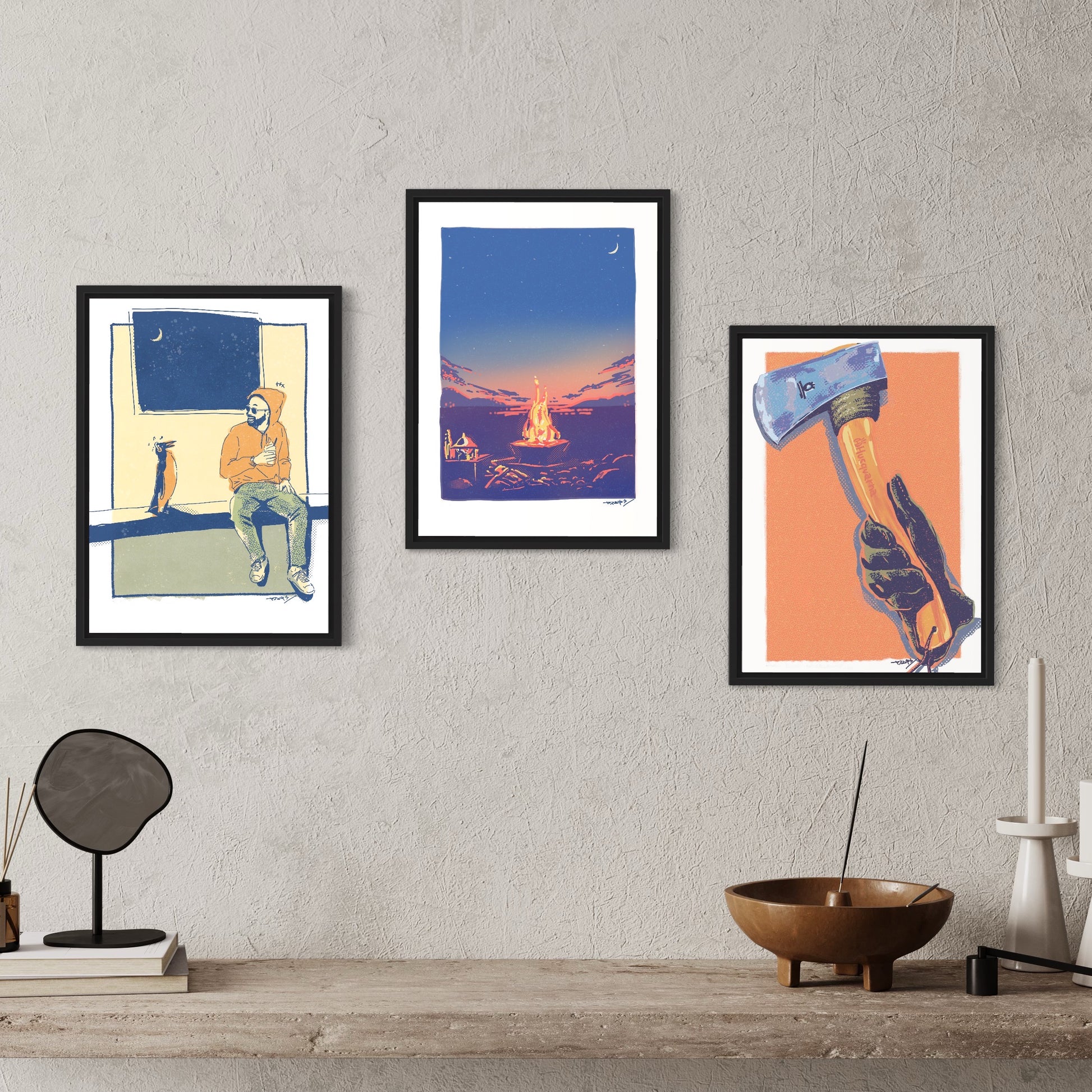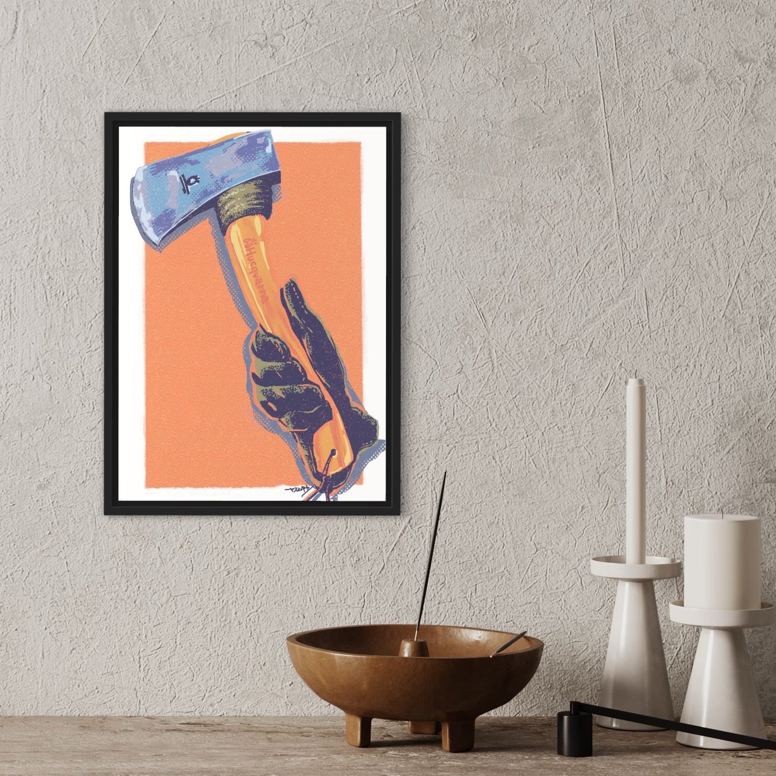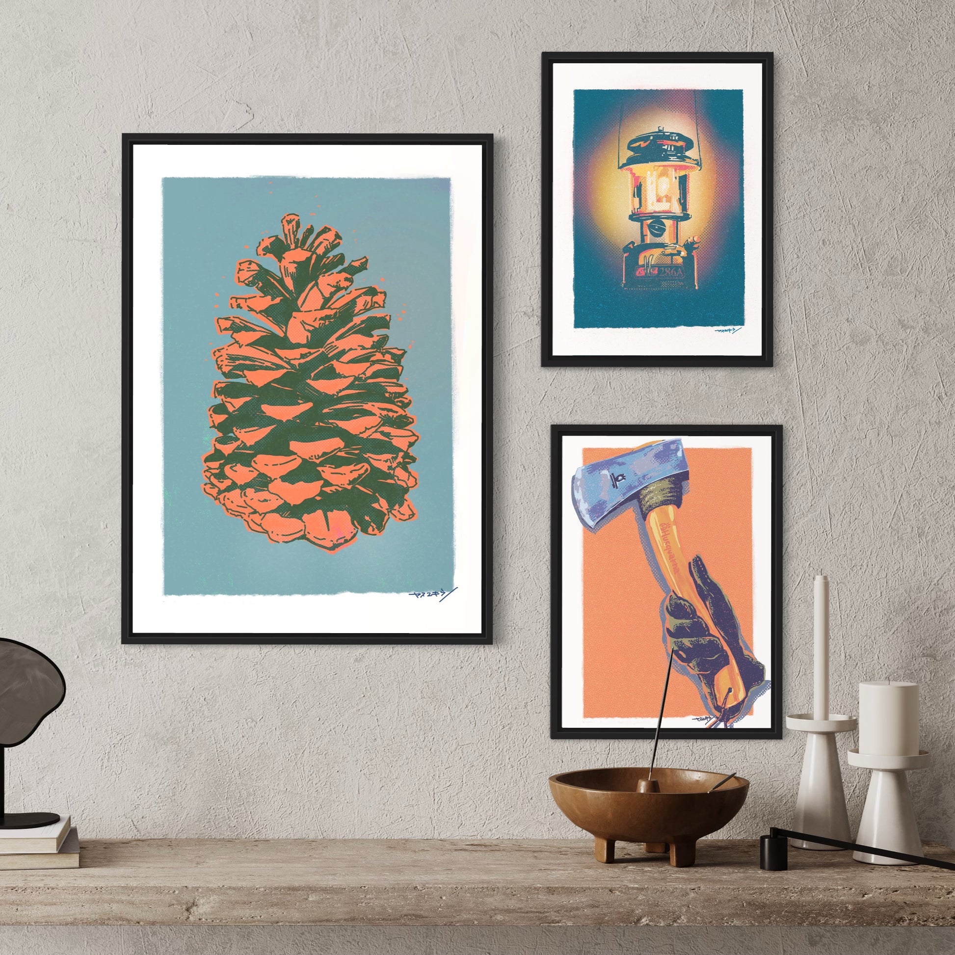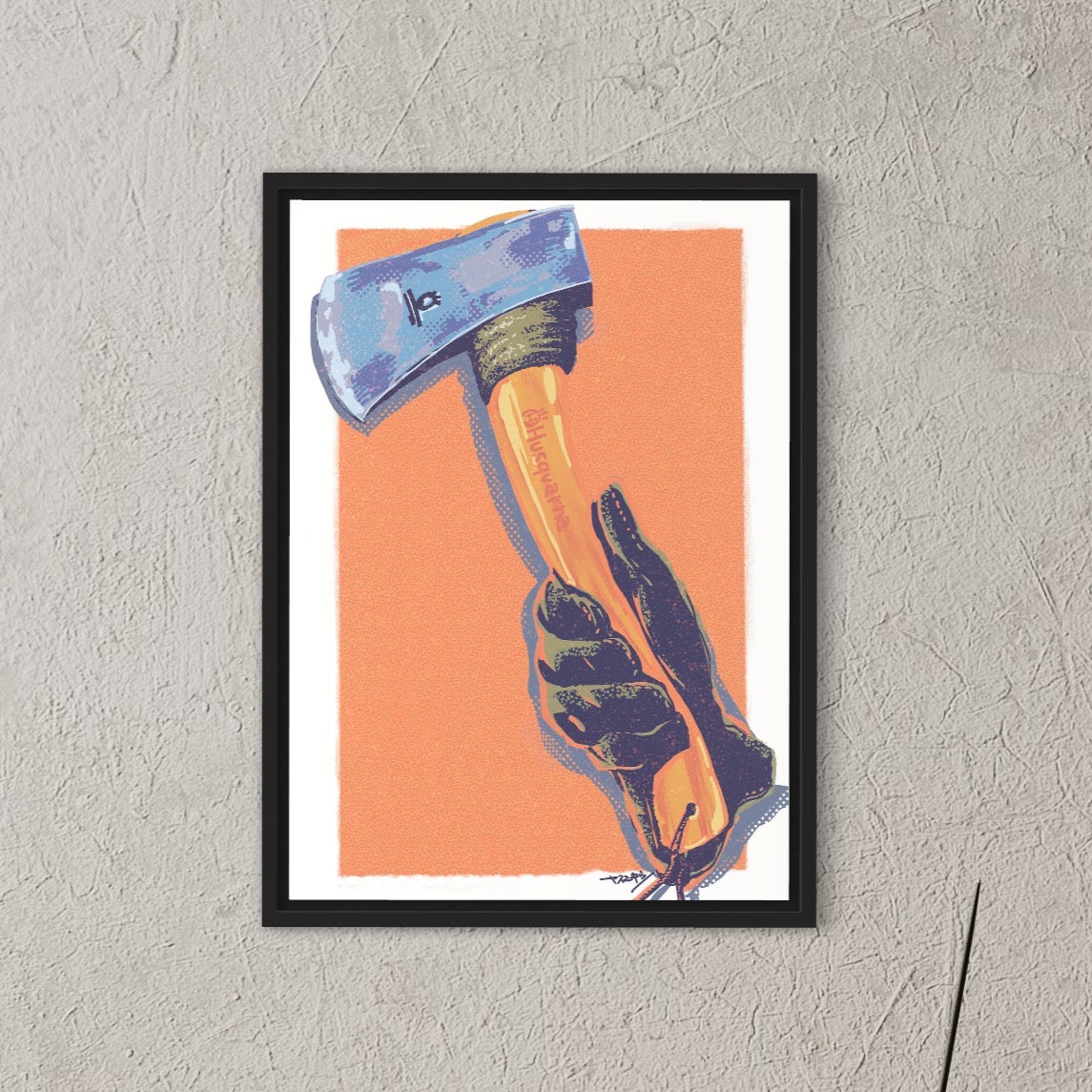 キャンプの醍醐味はやっぱり焚き火。その焚き火の薪を作るのにはやっぱり斧。斧ってかっこいいなー飾りたいなーと思って描いた作品。