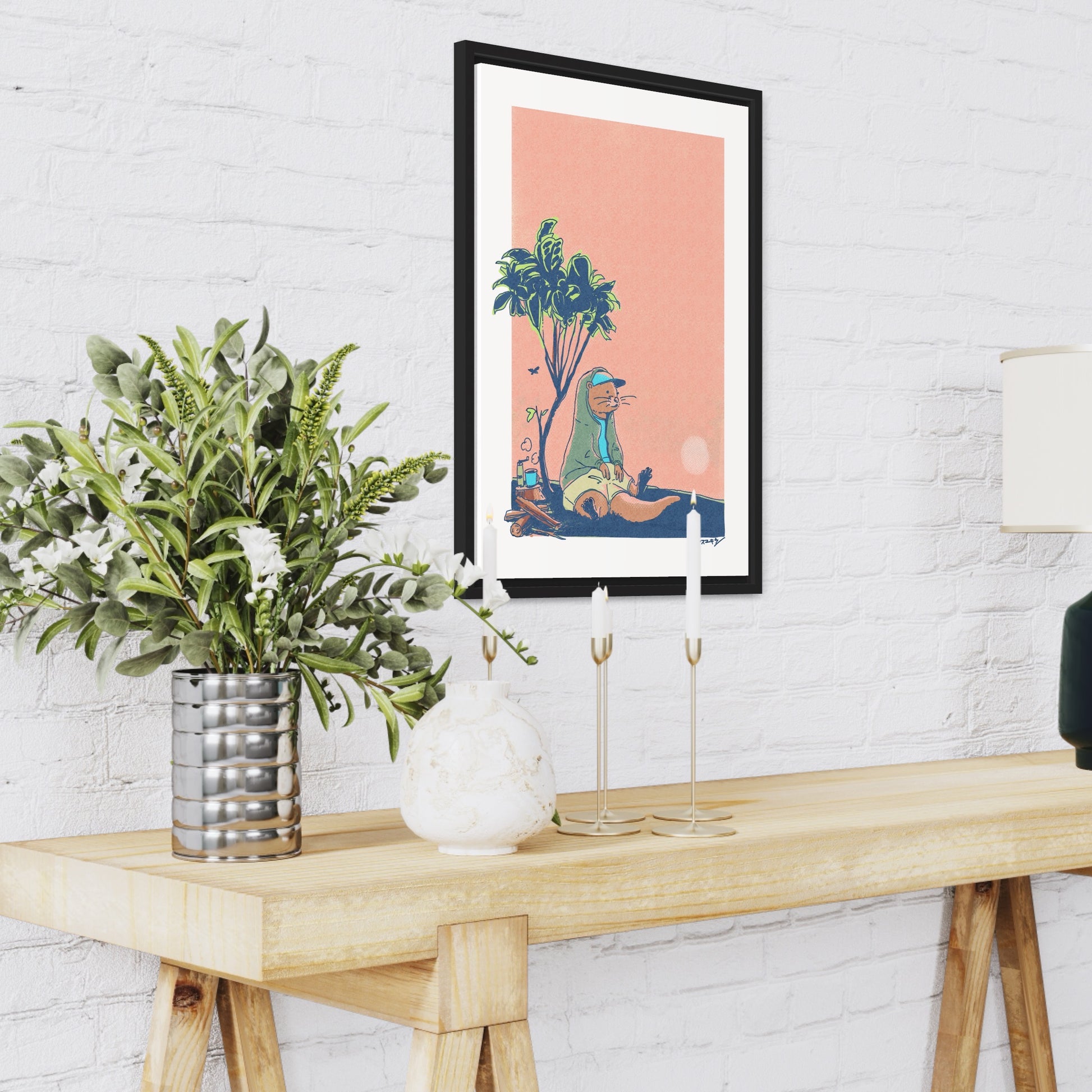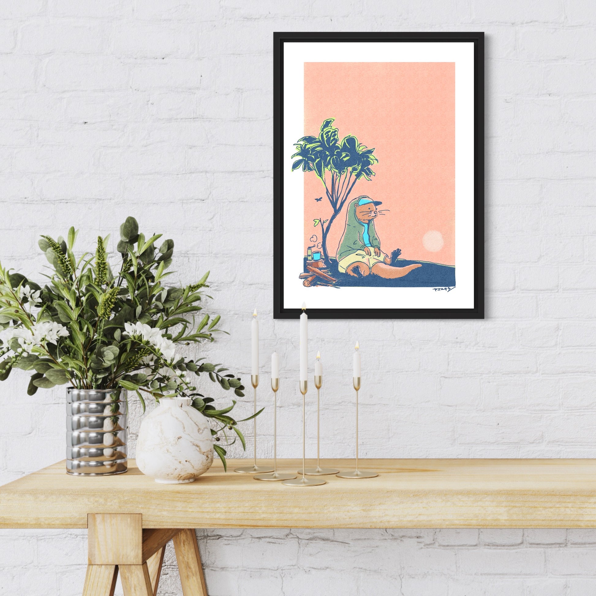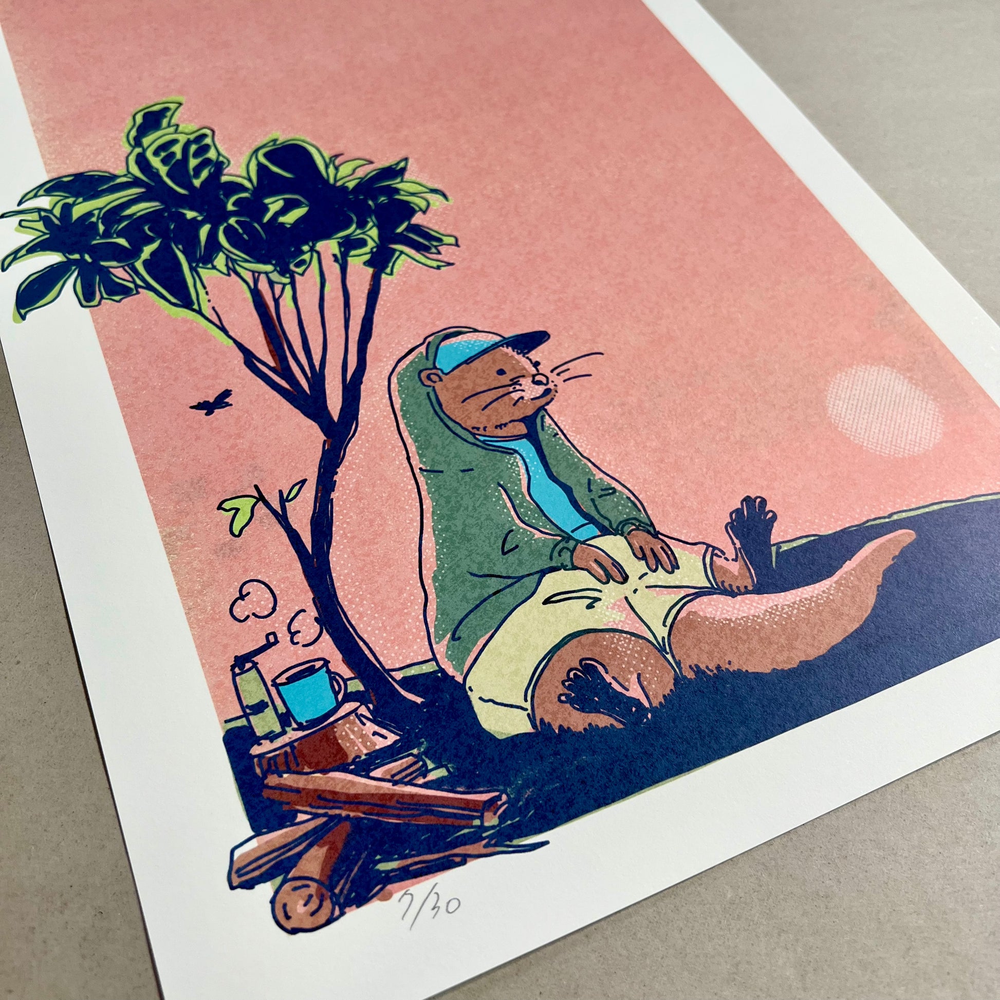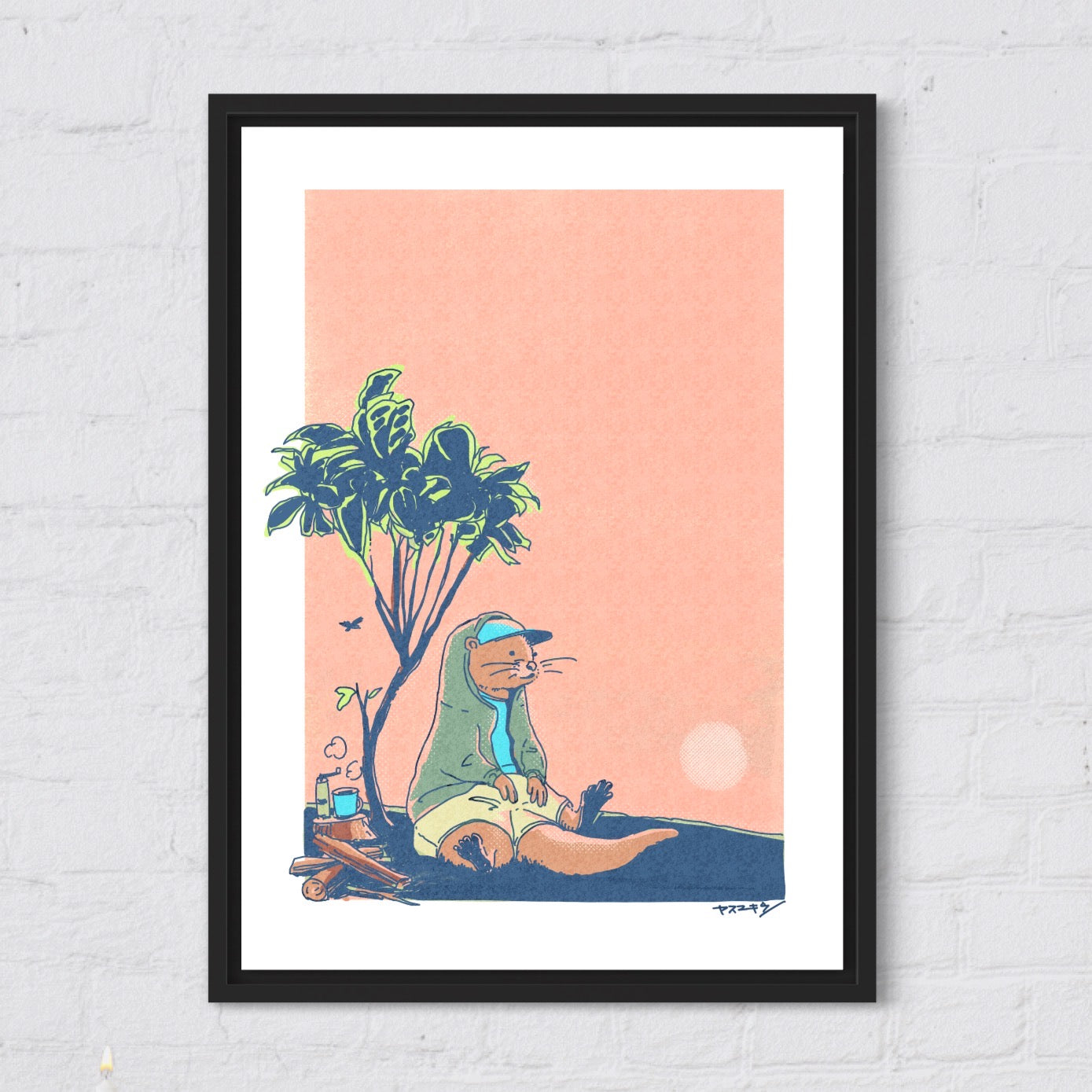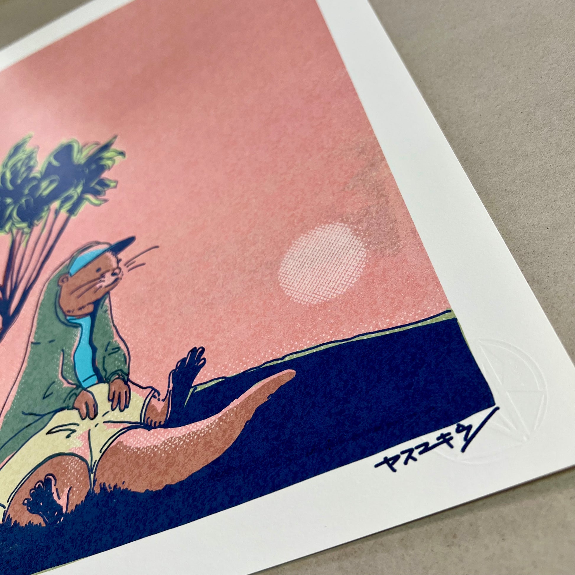 ピンクに染まる空の下でゆっくり流れる時間を感じながらボケーと佇める幸せ。そんな幸せな時間をカワウソさんで表現した作品。