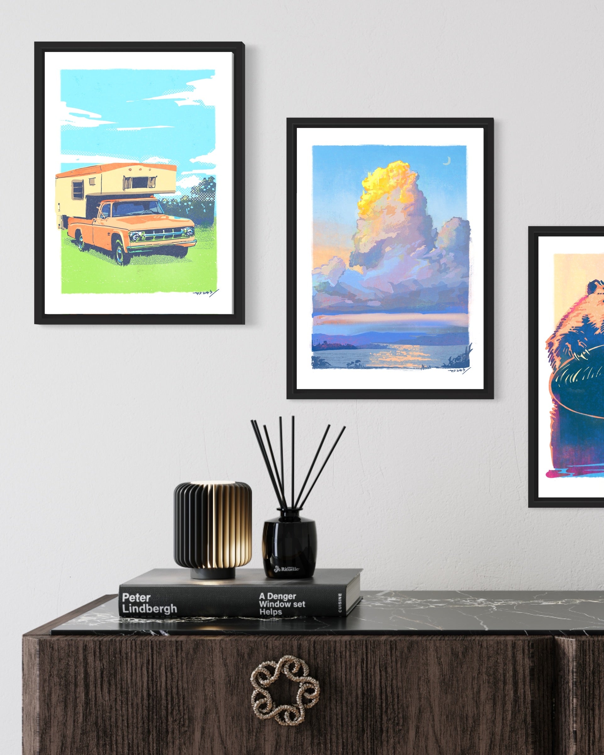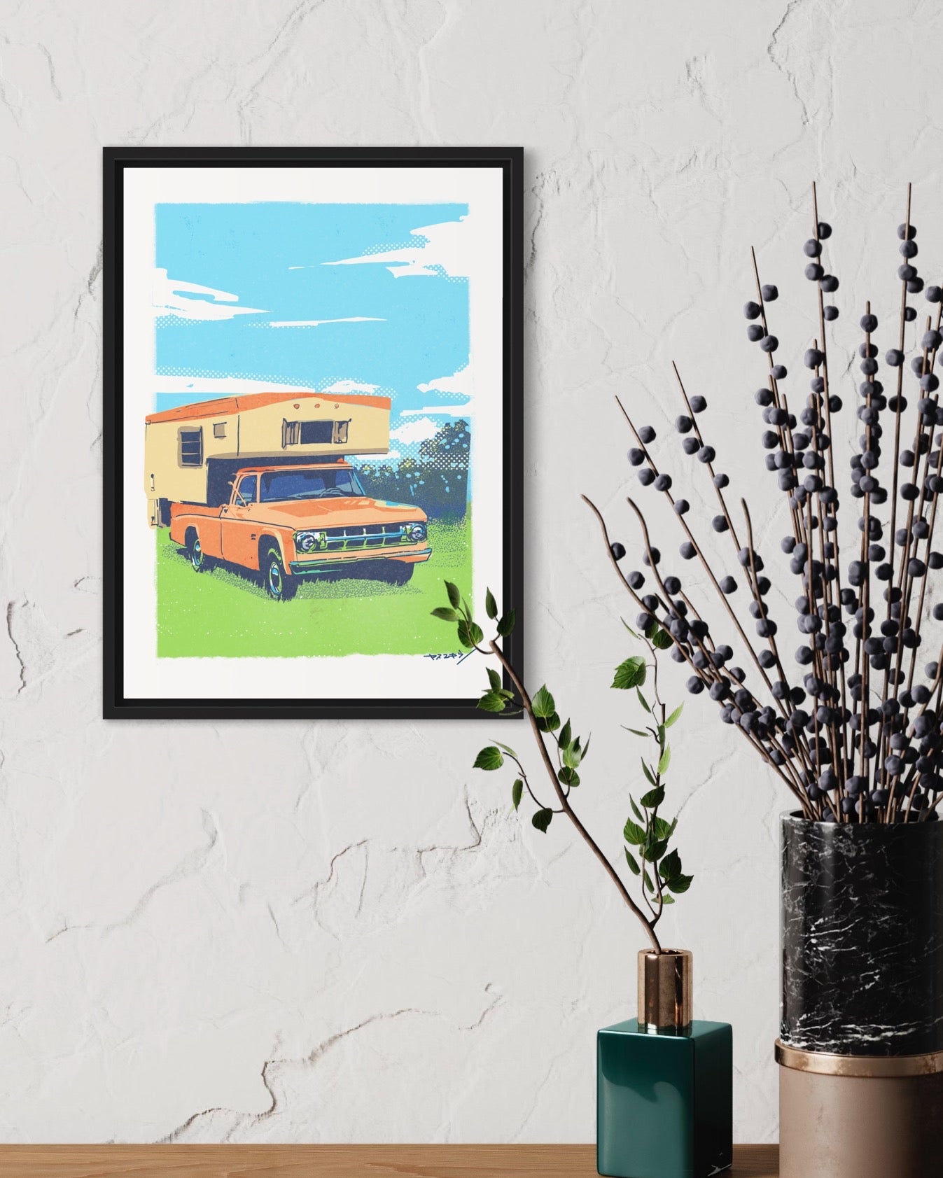 普通乗用のバンの後ろに家を無理矢理くっつけた様なデザイン。この家を持って移動したら楽しいだろうを実現した車が本当にかっこよく、見てるだけで何かのどかな気分にさせてくれる一コマを描いた作品