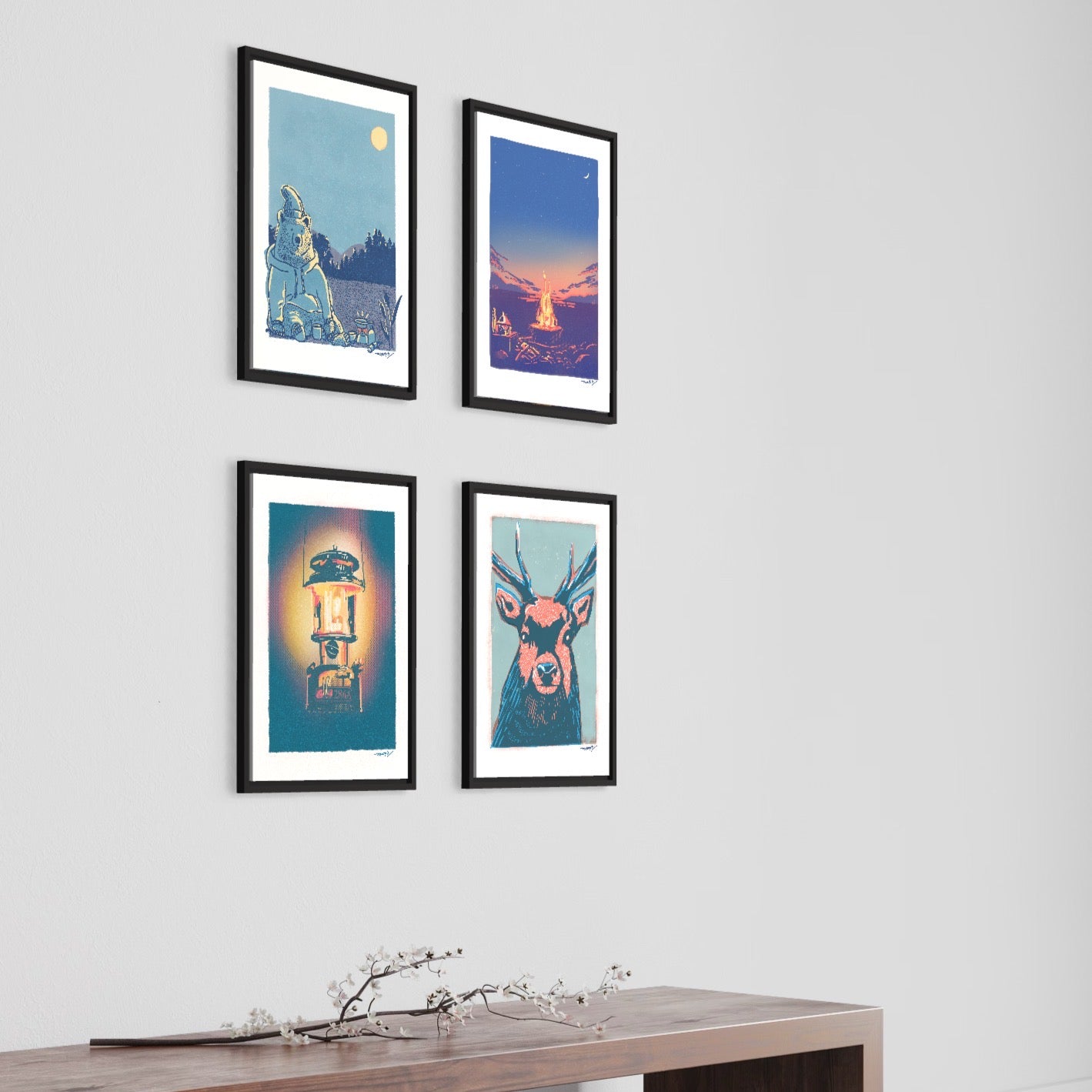 月明かりで最小限のギアでコーヒータイムを楽しむ。地面に座ってテーブルも置かずランタンも置かず、こんな感じでアウトドアを楽しみたいと思いながら描いた作品。
