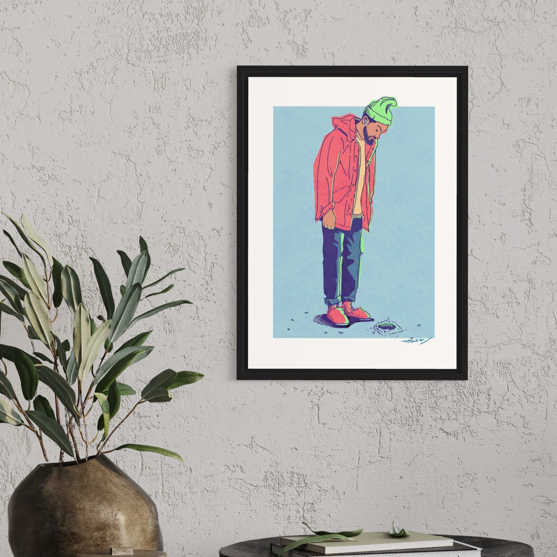ご機嫌に部屋で音楽を聴いてたら、何かが現れそれをあわてて追っかけてきたら穴の中に。あれは何だったんだろう・・・そんな思いで穴を見つめる男性を描いた作品