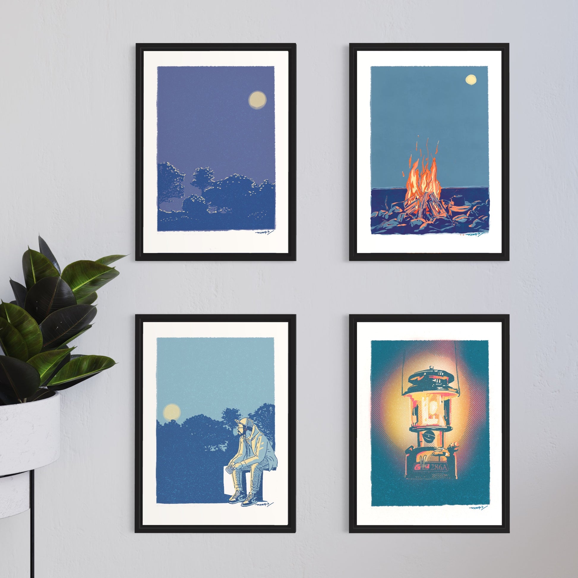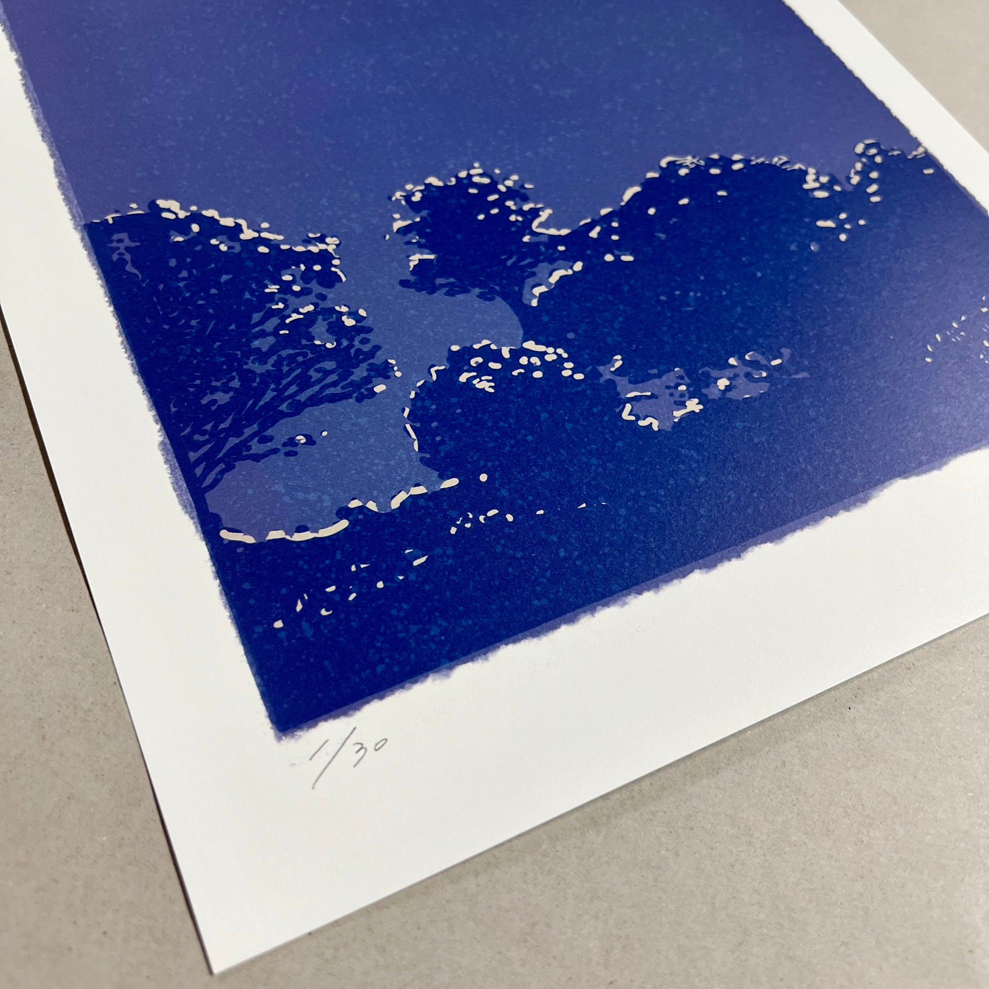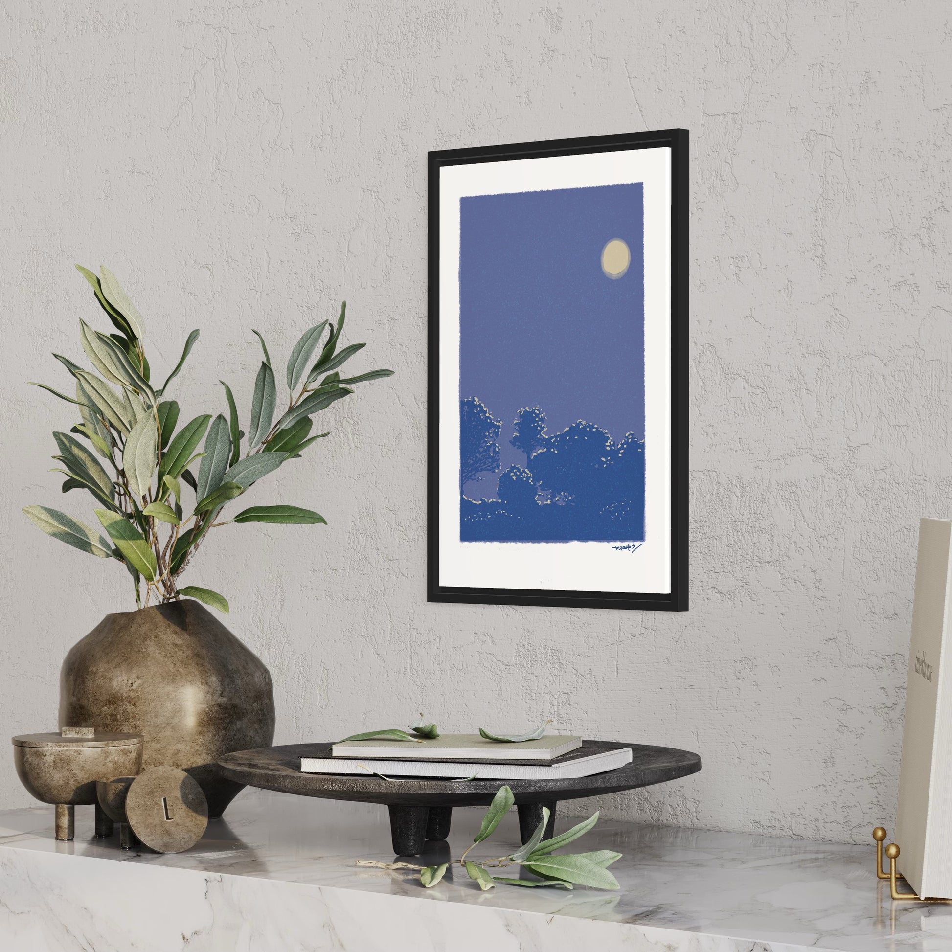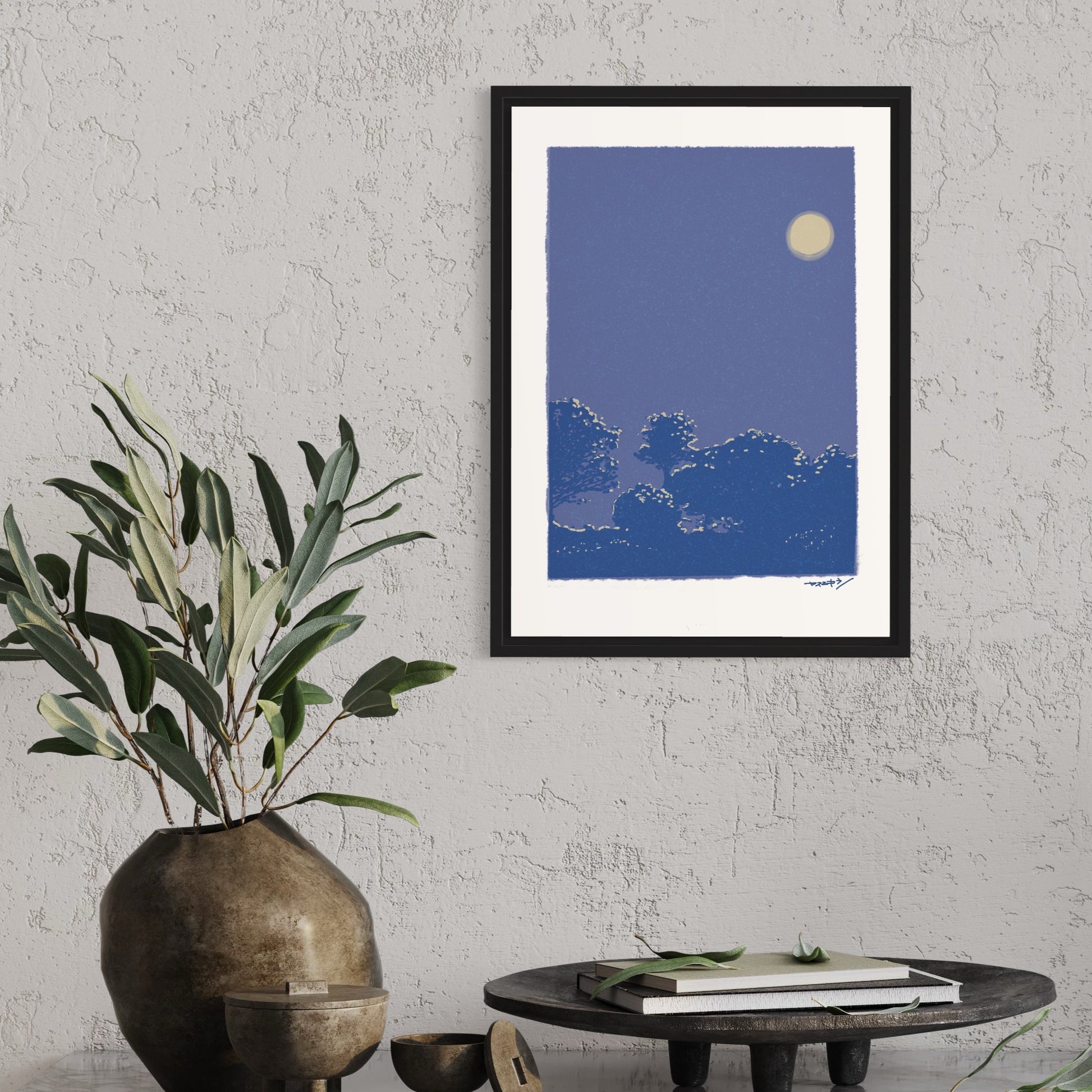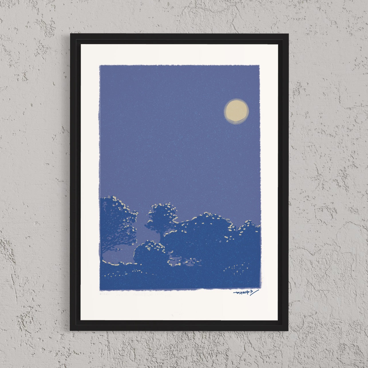 寝静まった夜にぼんやり浮かぶ満月。月夜の色と静けさを表現した作品。