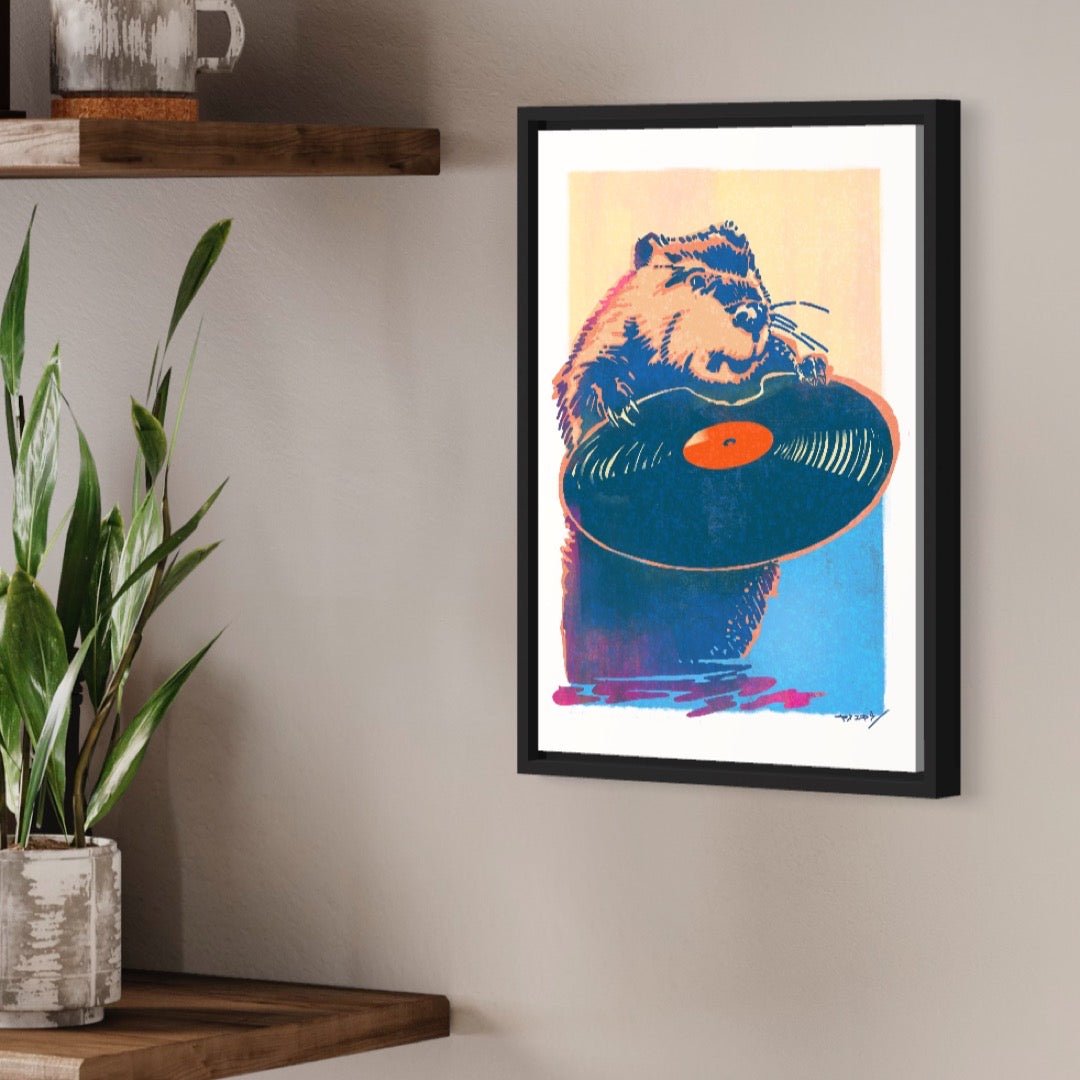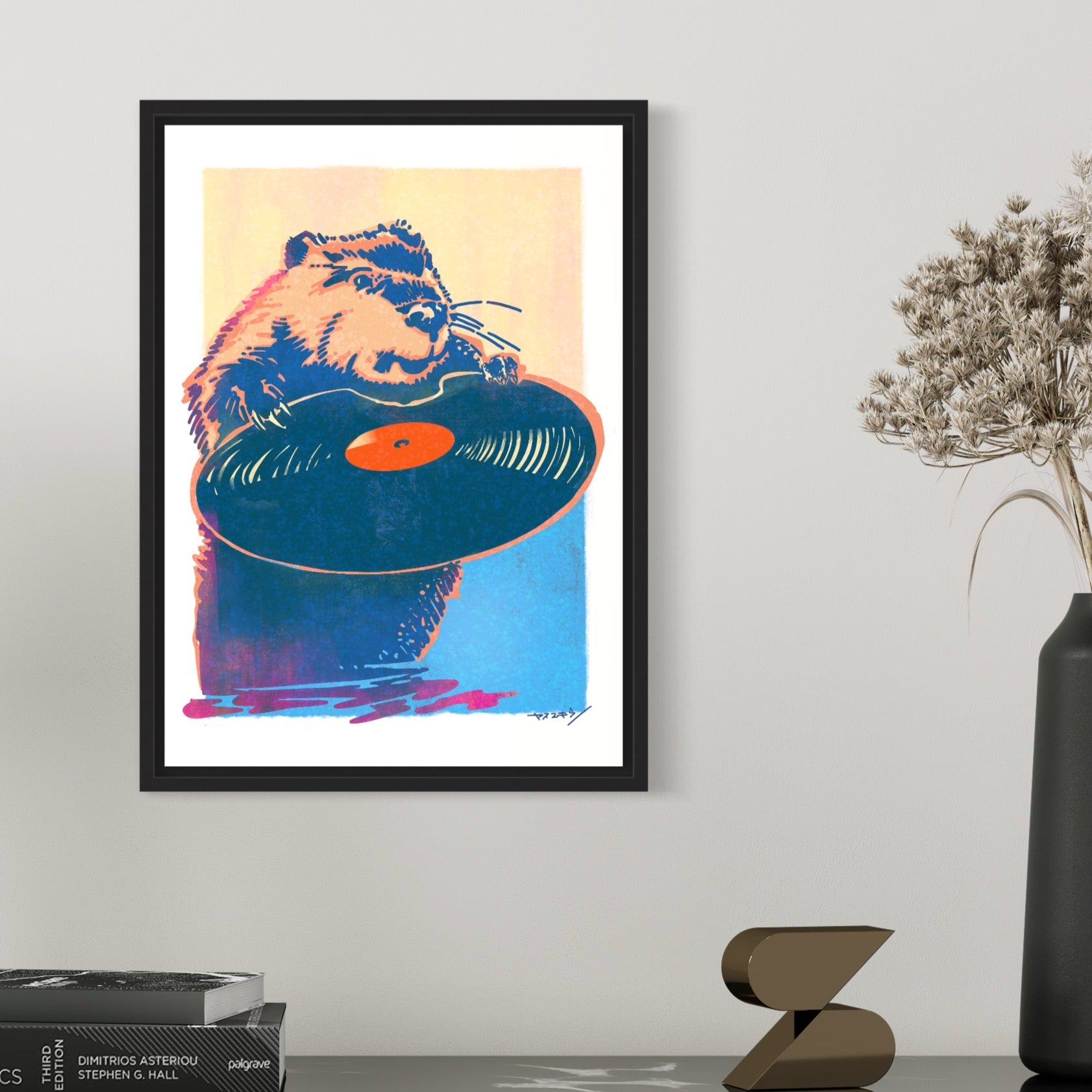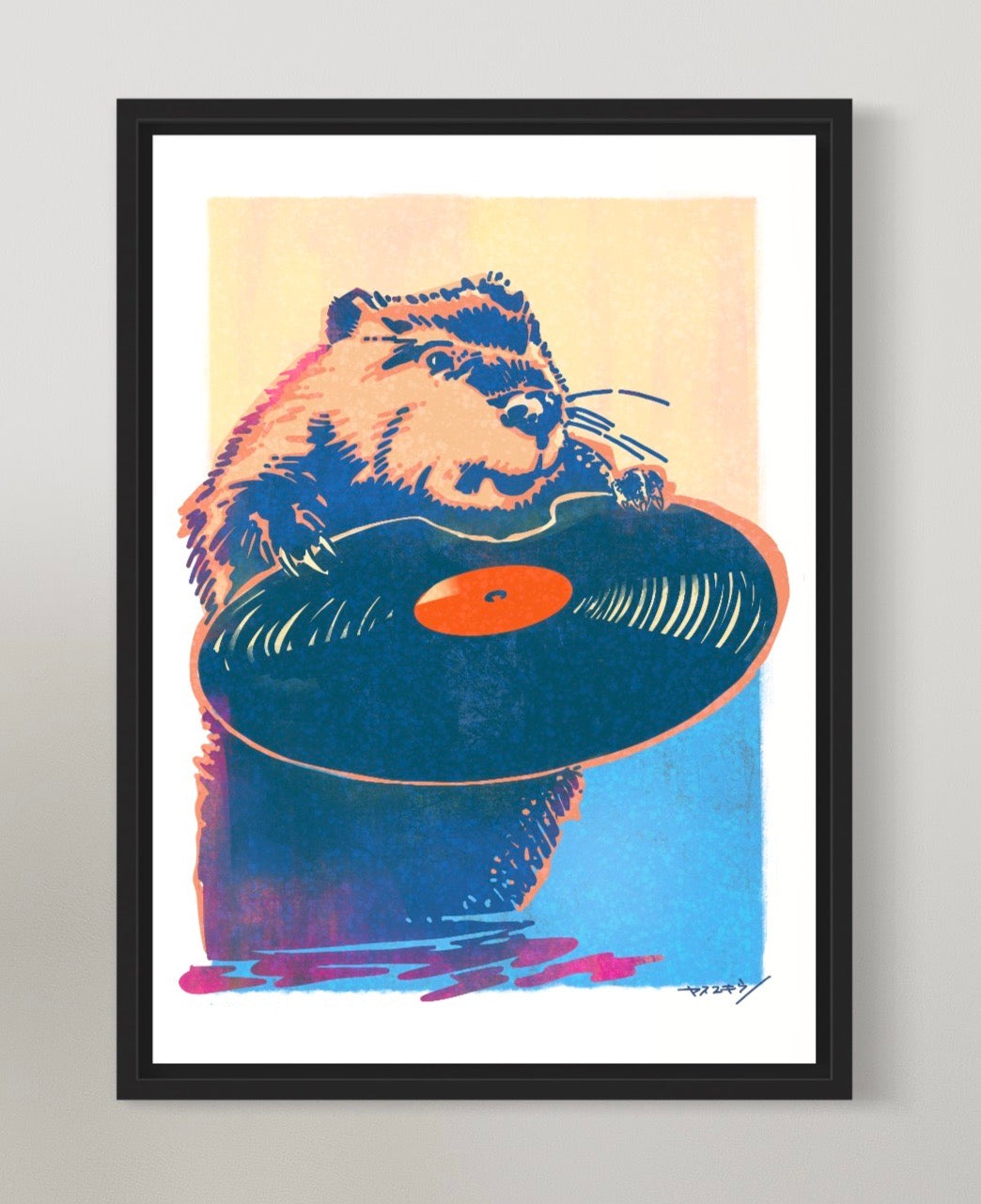 川にダムを築き我が家を制作するビーバーさん。お家作りの材料集めの時に拾った12inchレコードを思わずがじり。こんな風景があっても面白いなーと思いながら描いた作品