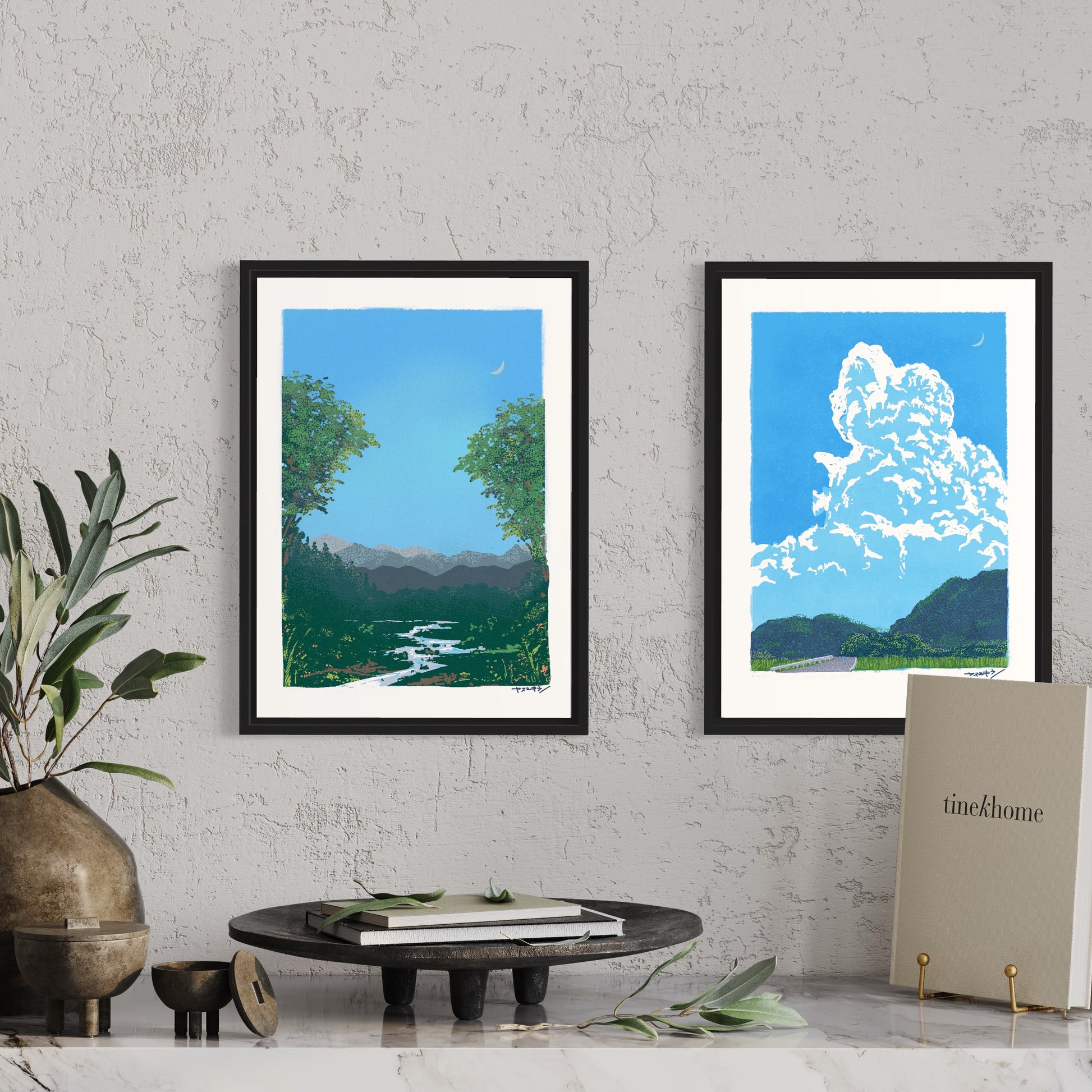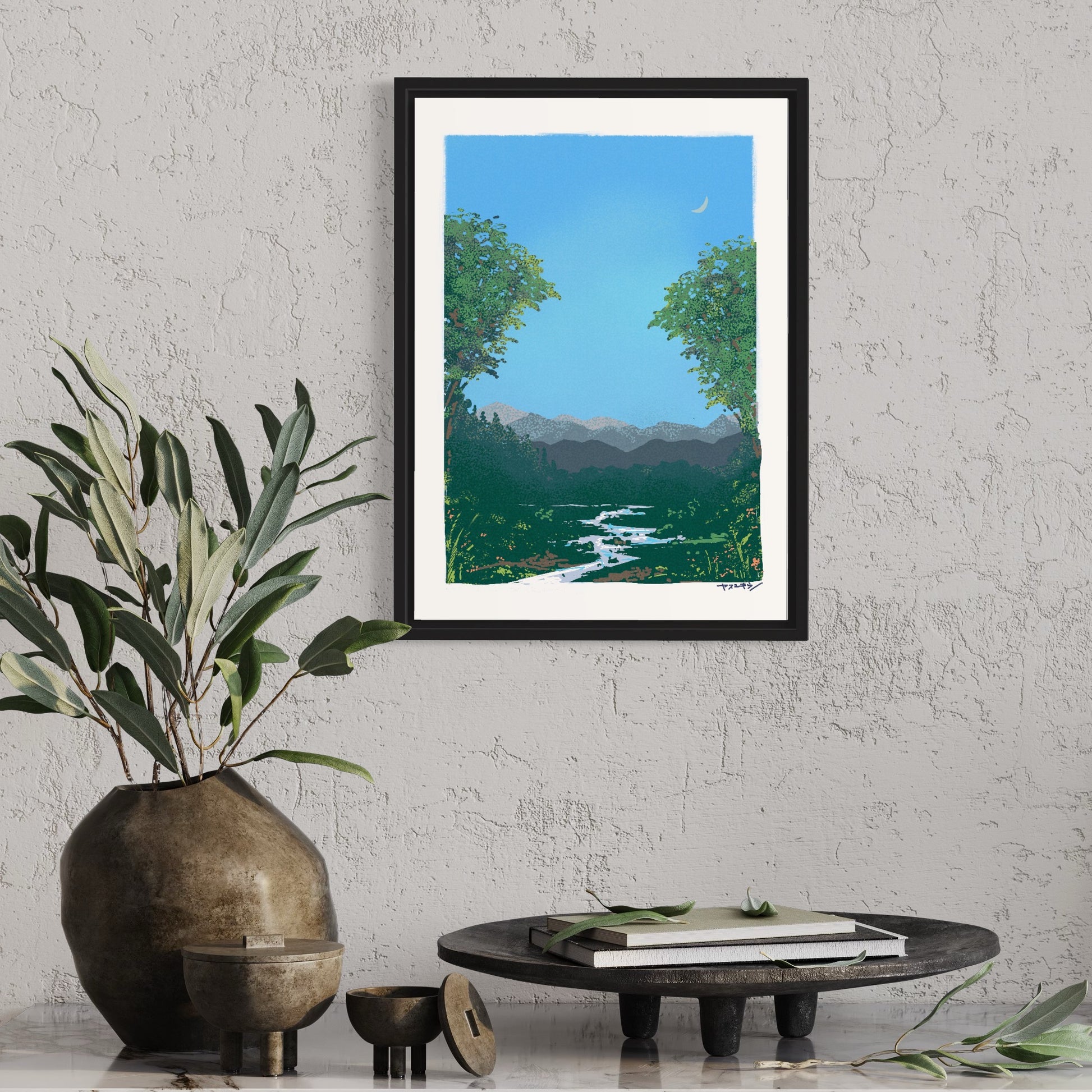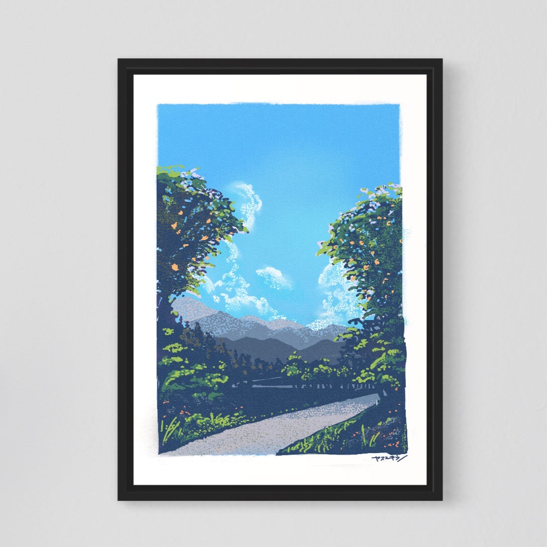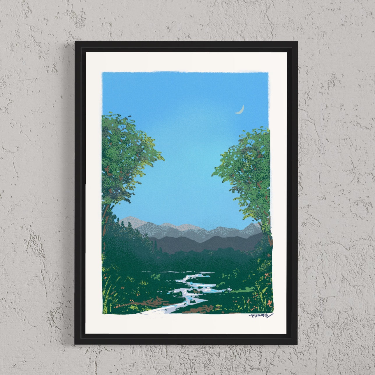 青空と青々した緑の奥に遠くに見える山々。青空にうっすら浮かぶ三日月。部屋の中に自然の奥行きを感じたいという思いから描いたイラスト的な作品。