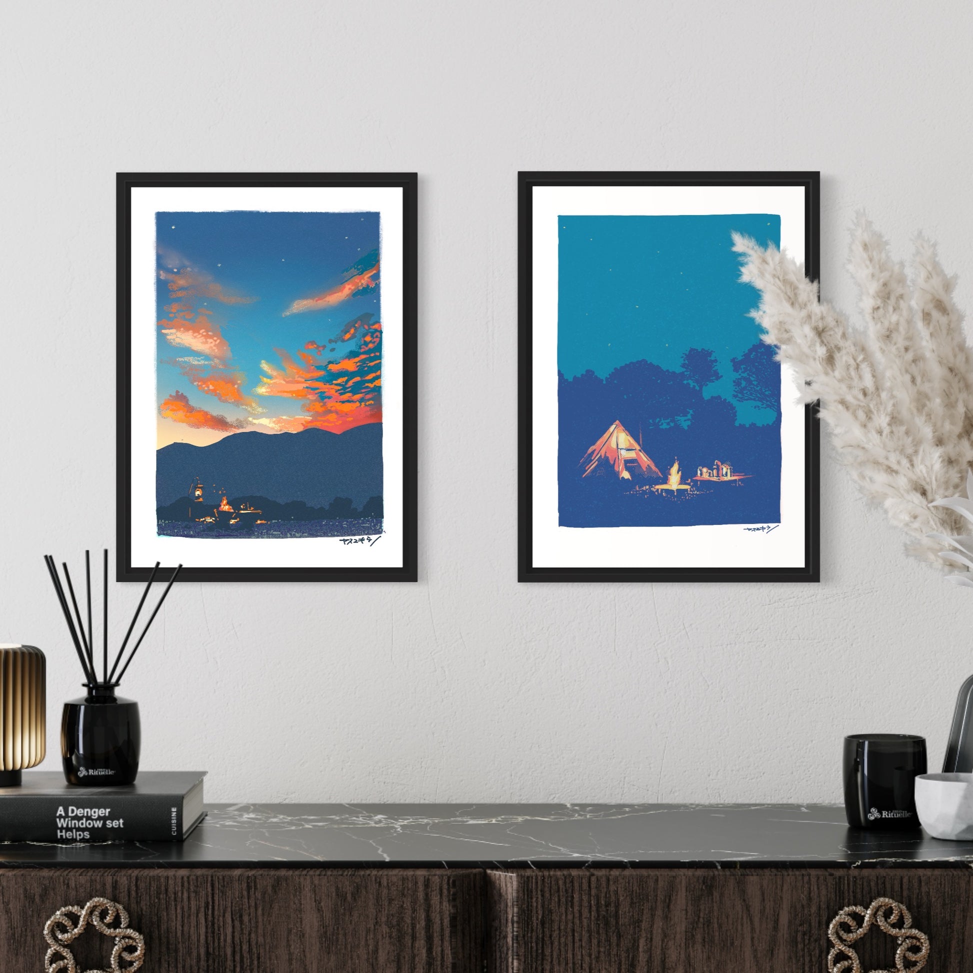 これから日が暮れて焚き火を楽しもう。ランタンに灯を焚き火に火を灯して、夜に向けて一番楽しい夕暮れの時間をオレンジ色の空と共に切り取った作品。