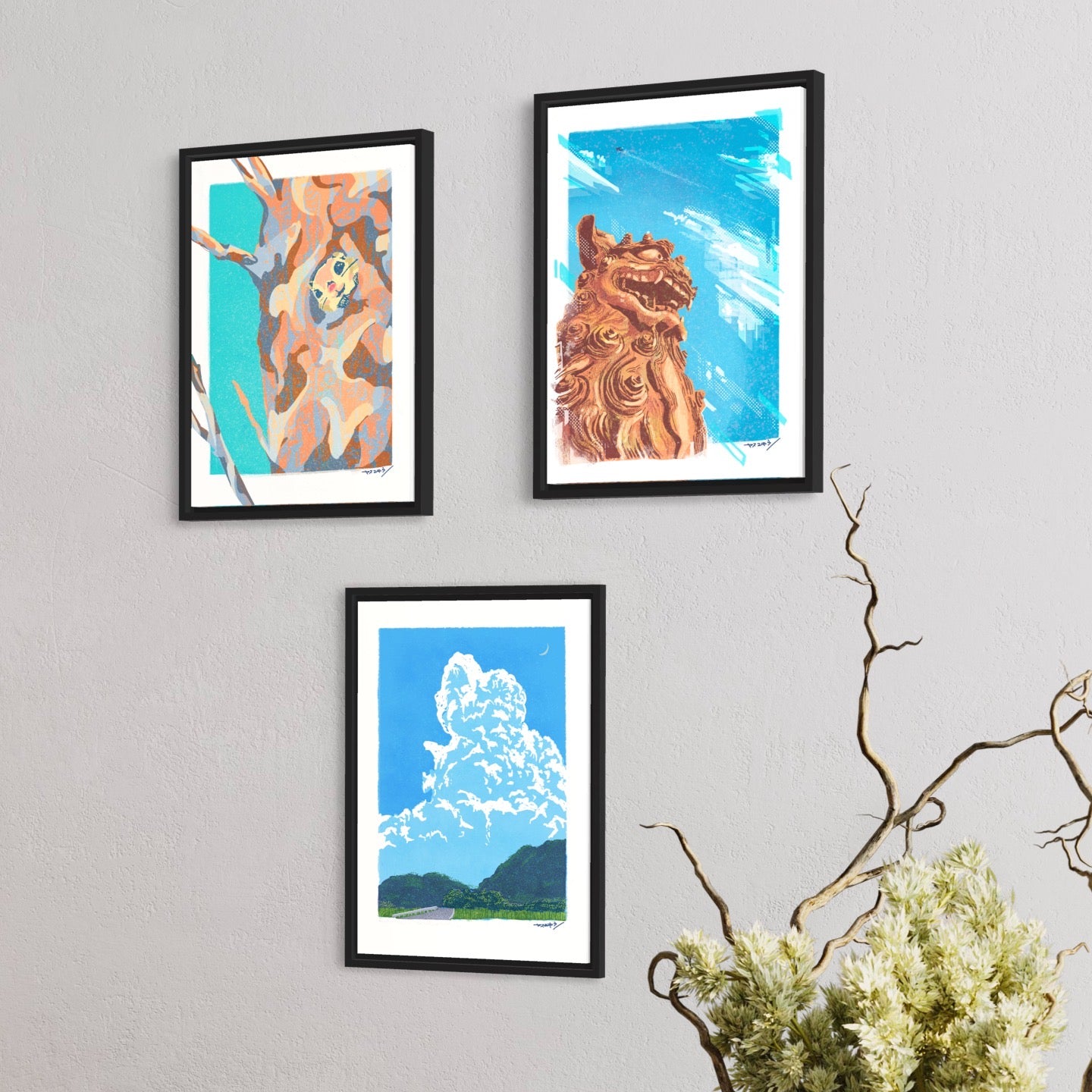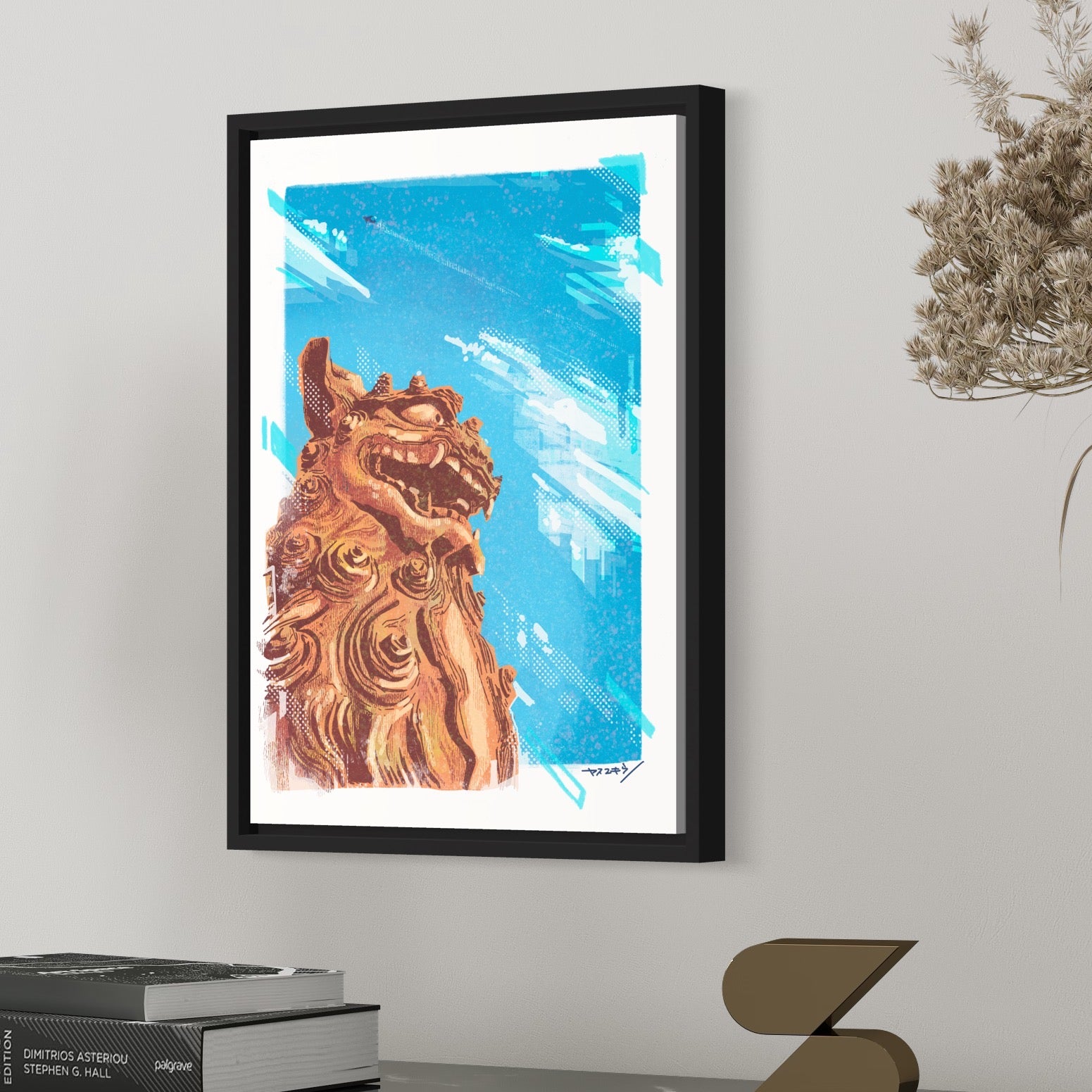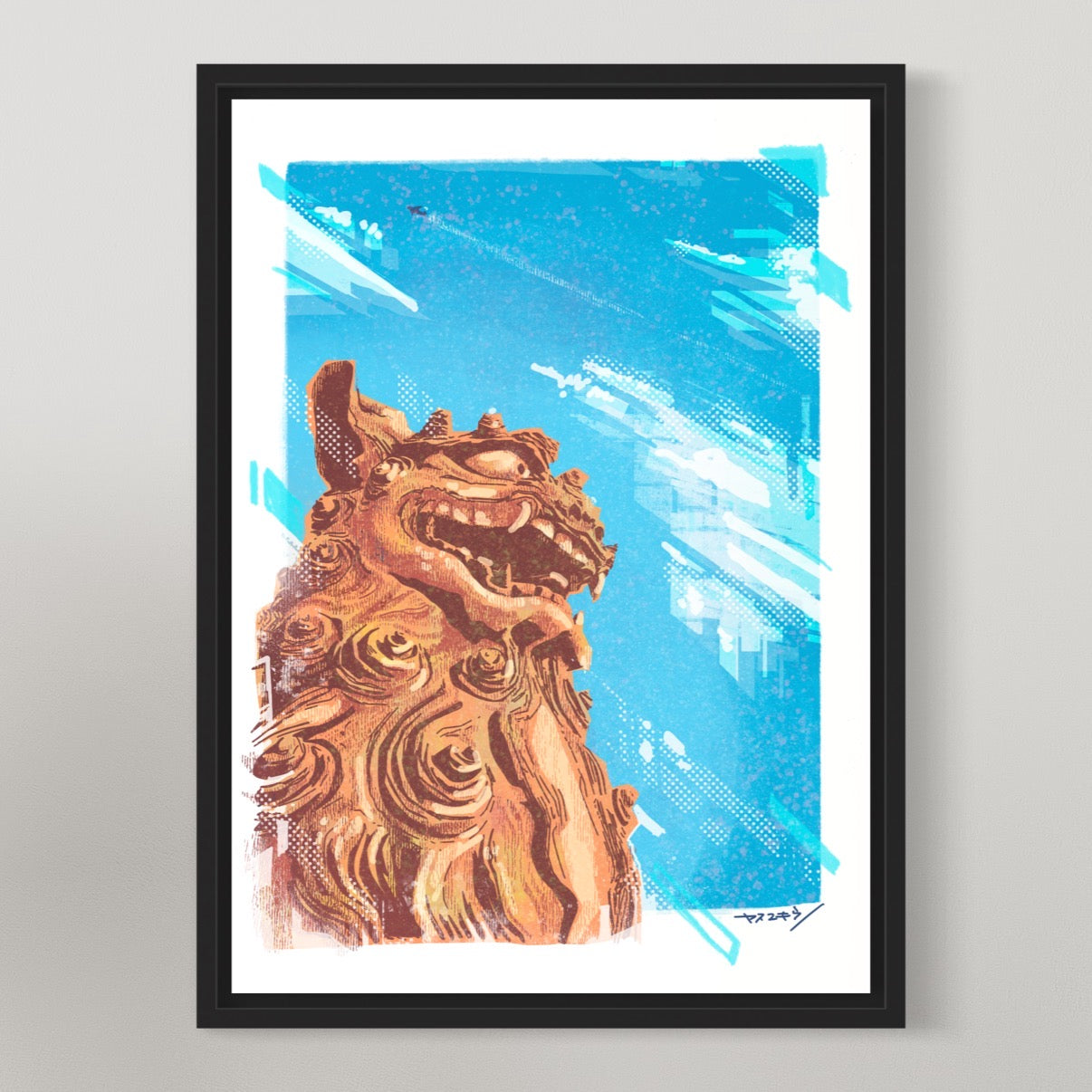 沖縄の青い空に映える赤茶色のシーサー。全ての沖縄好きのお家に飾ってほしいなーと思いながら描いた作品。