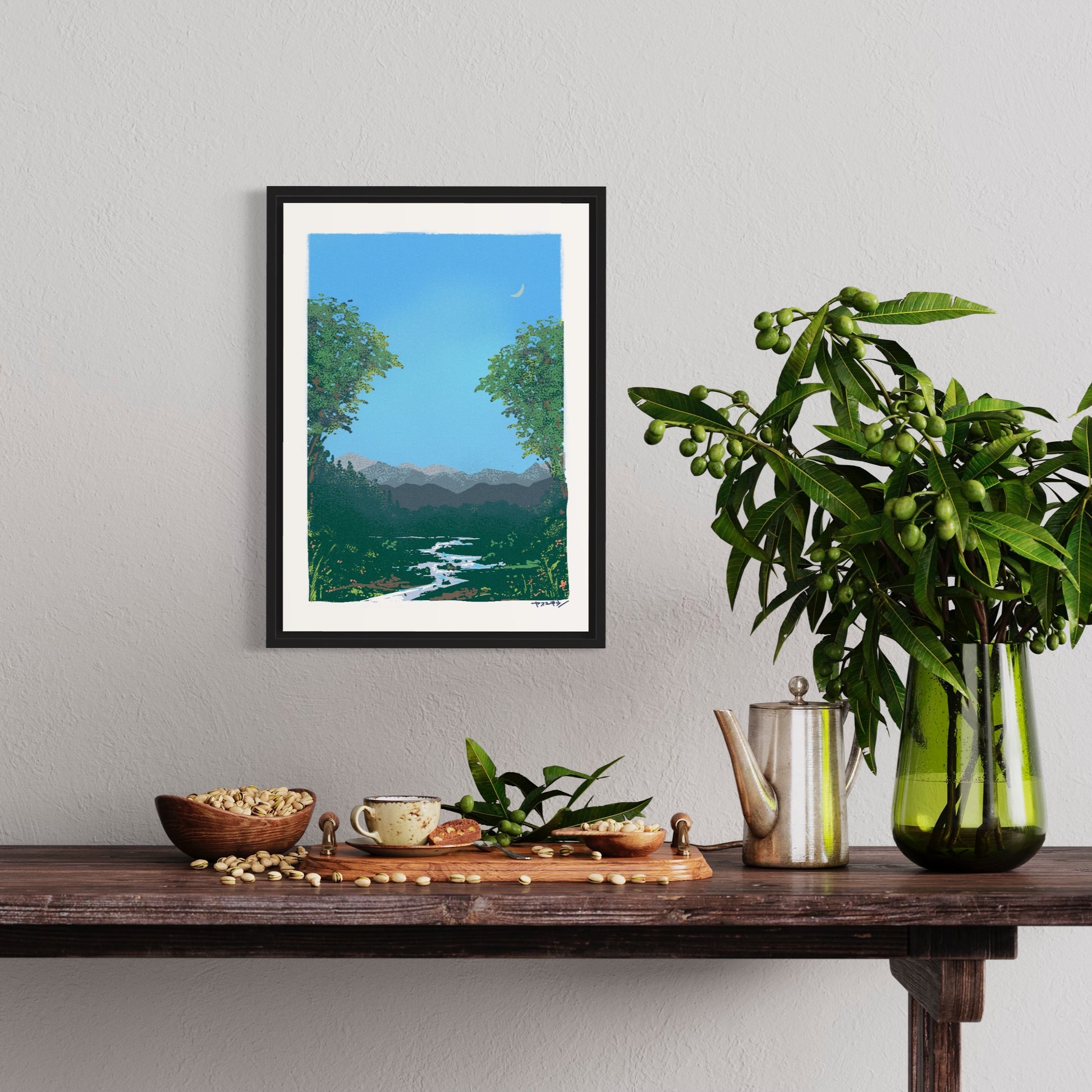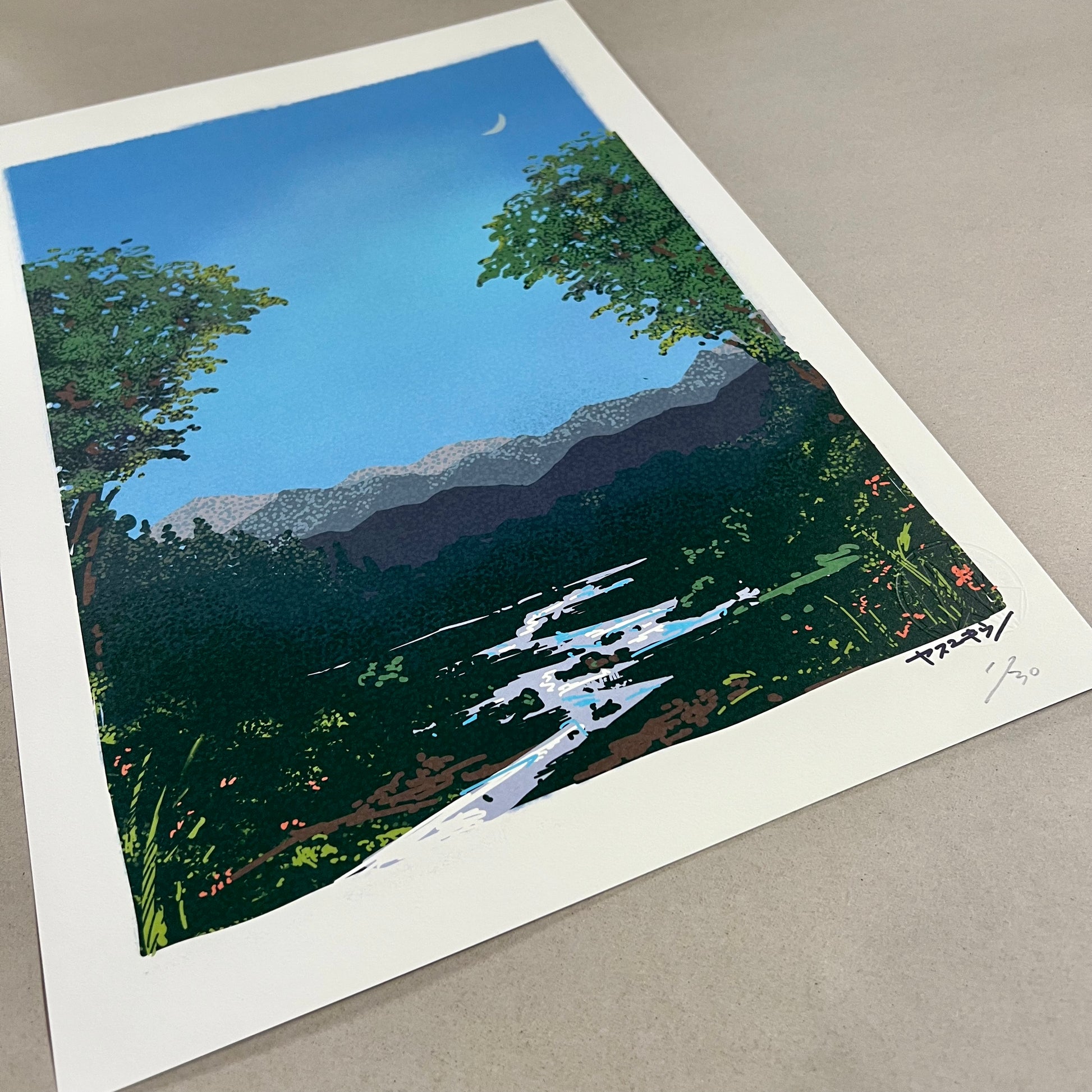 青々と繁った木々の間に流れる川、そして青空の中にうっすら浮かぶ月。どこかの丘の上から眺めた事を創造して描いたた作品