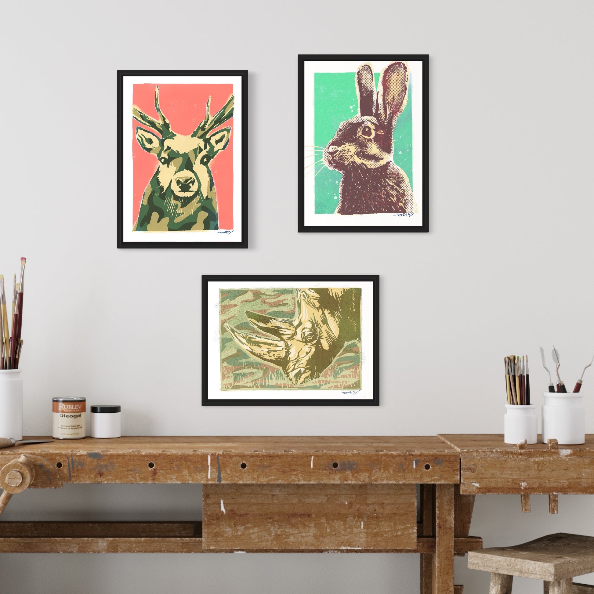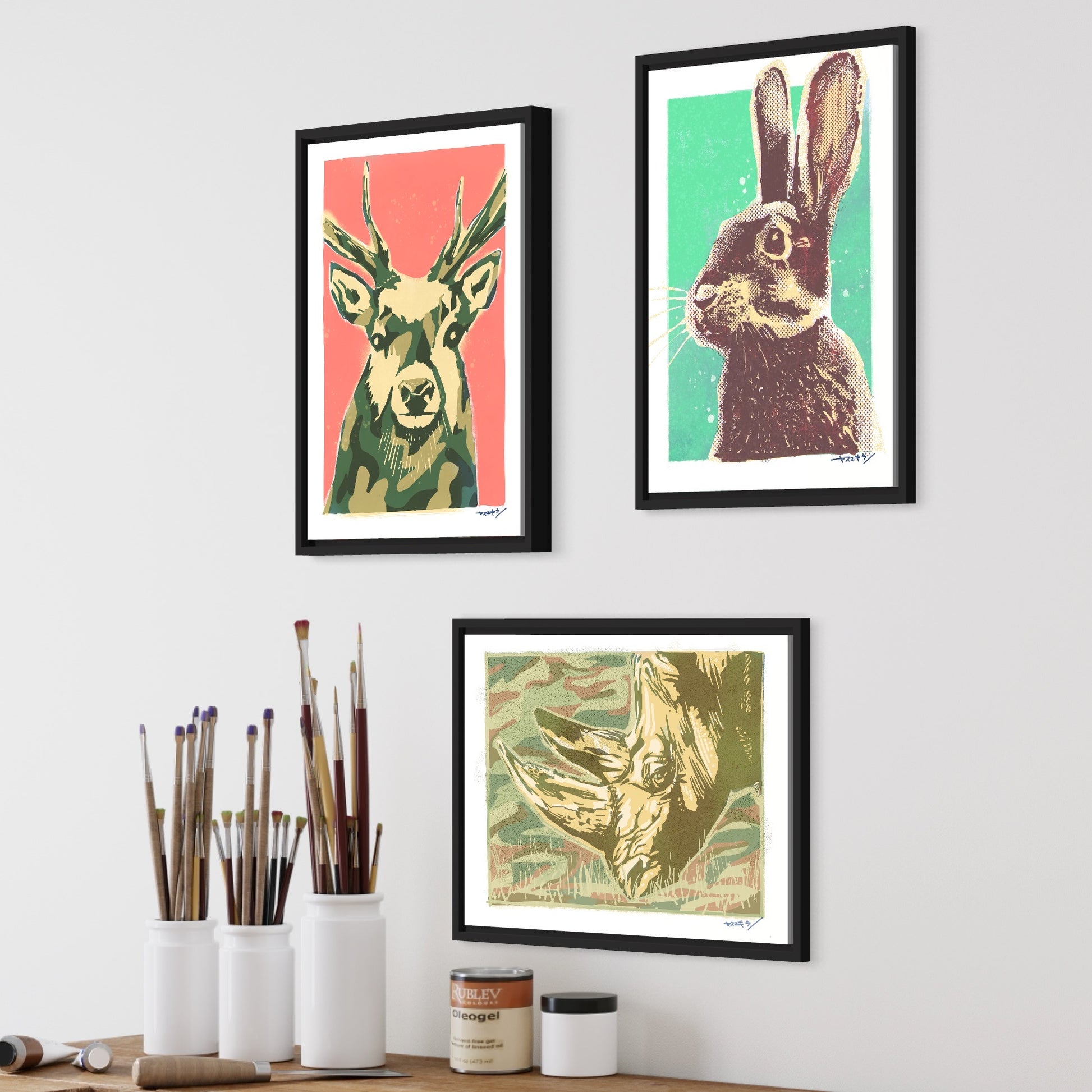耳を立てていつも鼻をひくひくさせて何を考えてるかわからないうさぎさん。そんなうさぎさんを版画っぽくステンシルアートっぽく小学生の頃の飼育委員の時を思い出しながら描いた作品。