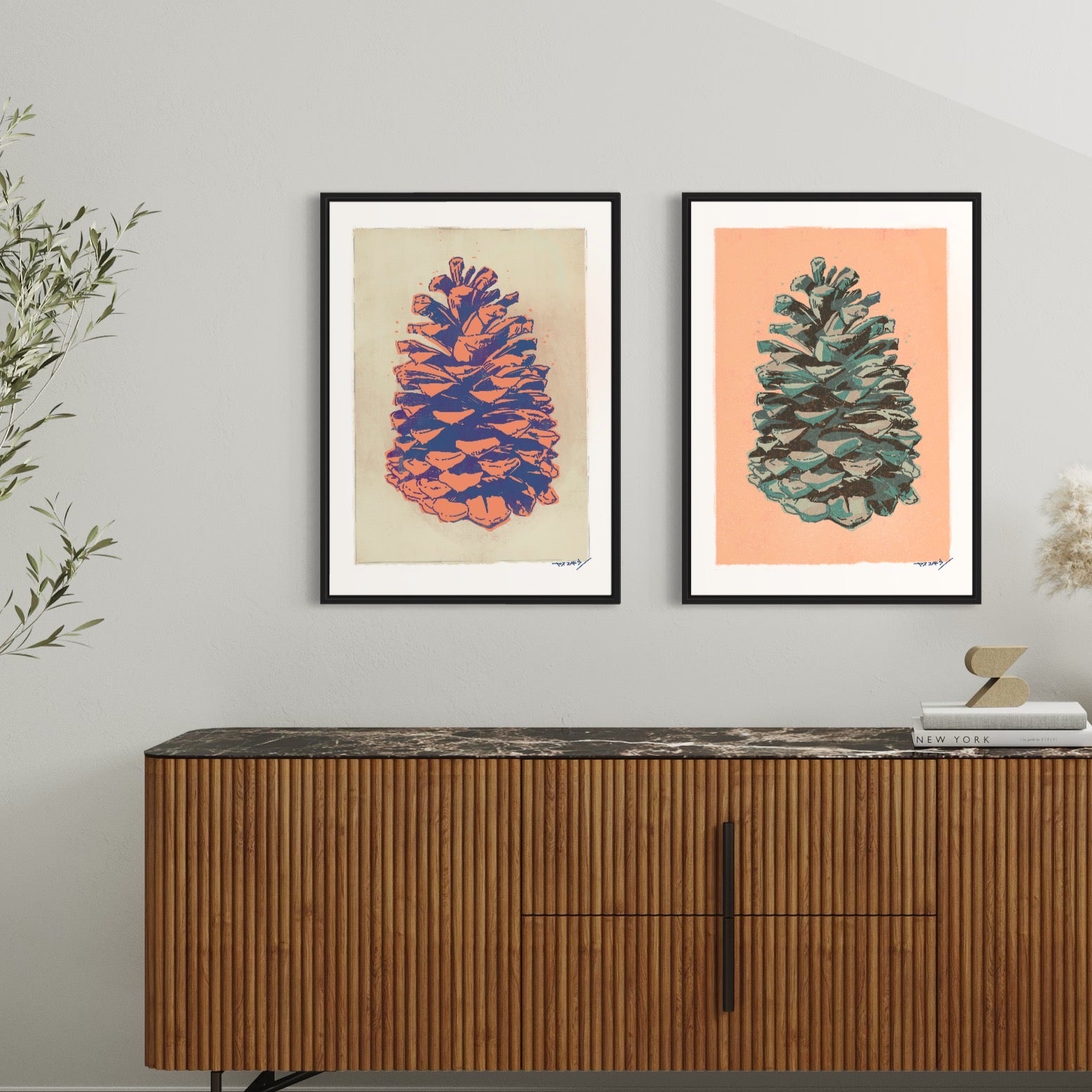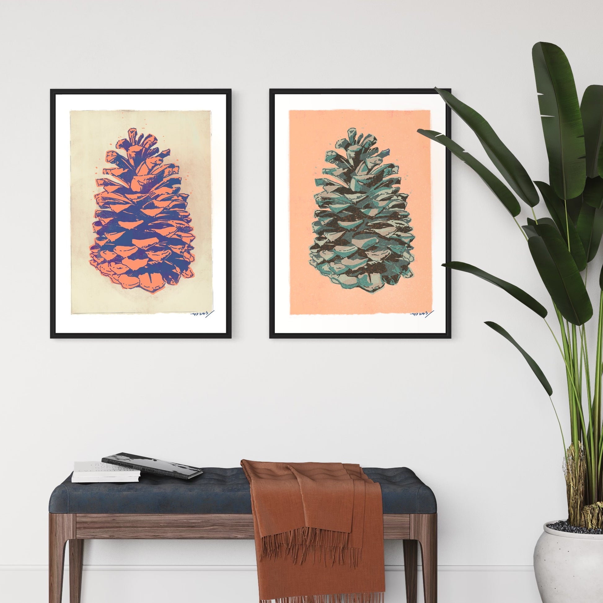 外国産の松の木になる大きな松ぼっくりを版画っぽくストリートアートっぽく描いた作品。