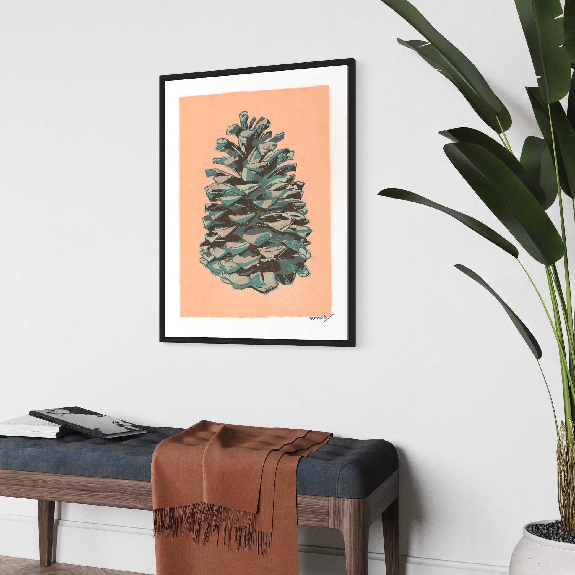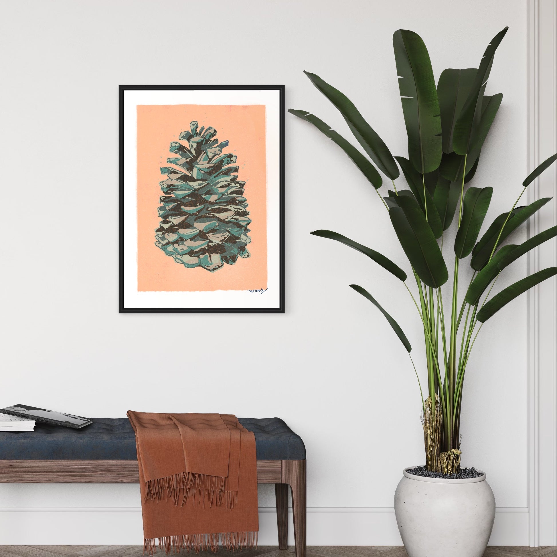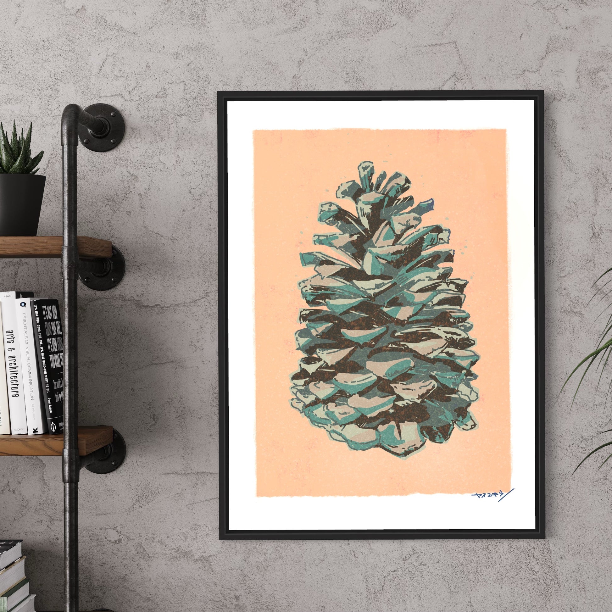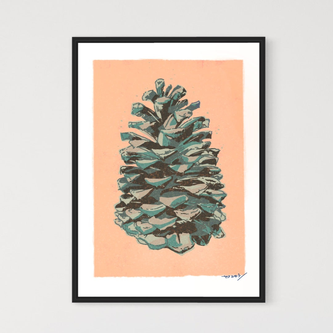 外国産の松の木になる大きな松ぼっくりを版画っぽくストリートアートっぽく描いた作品。