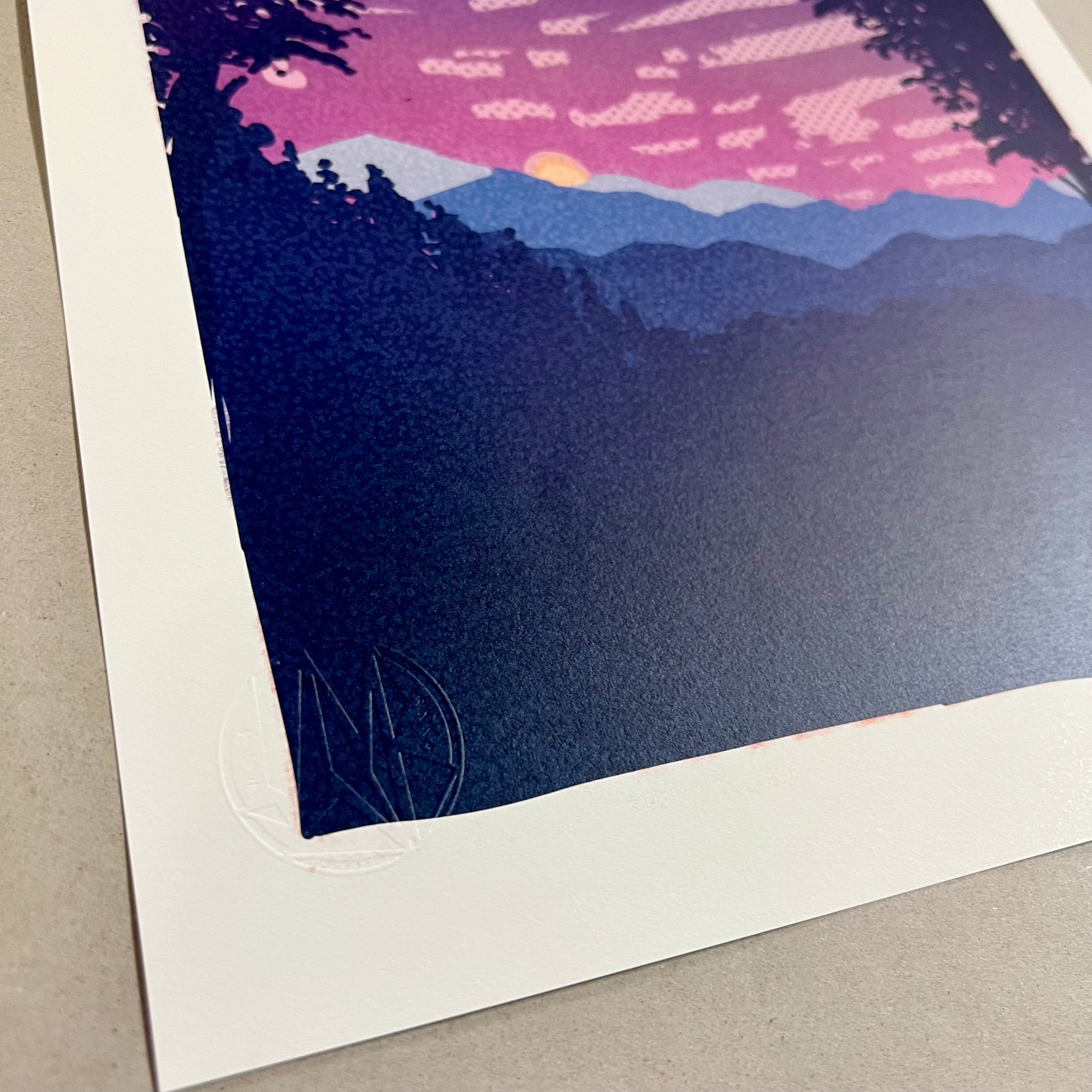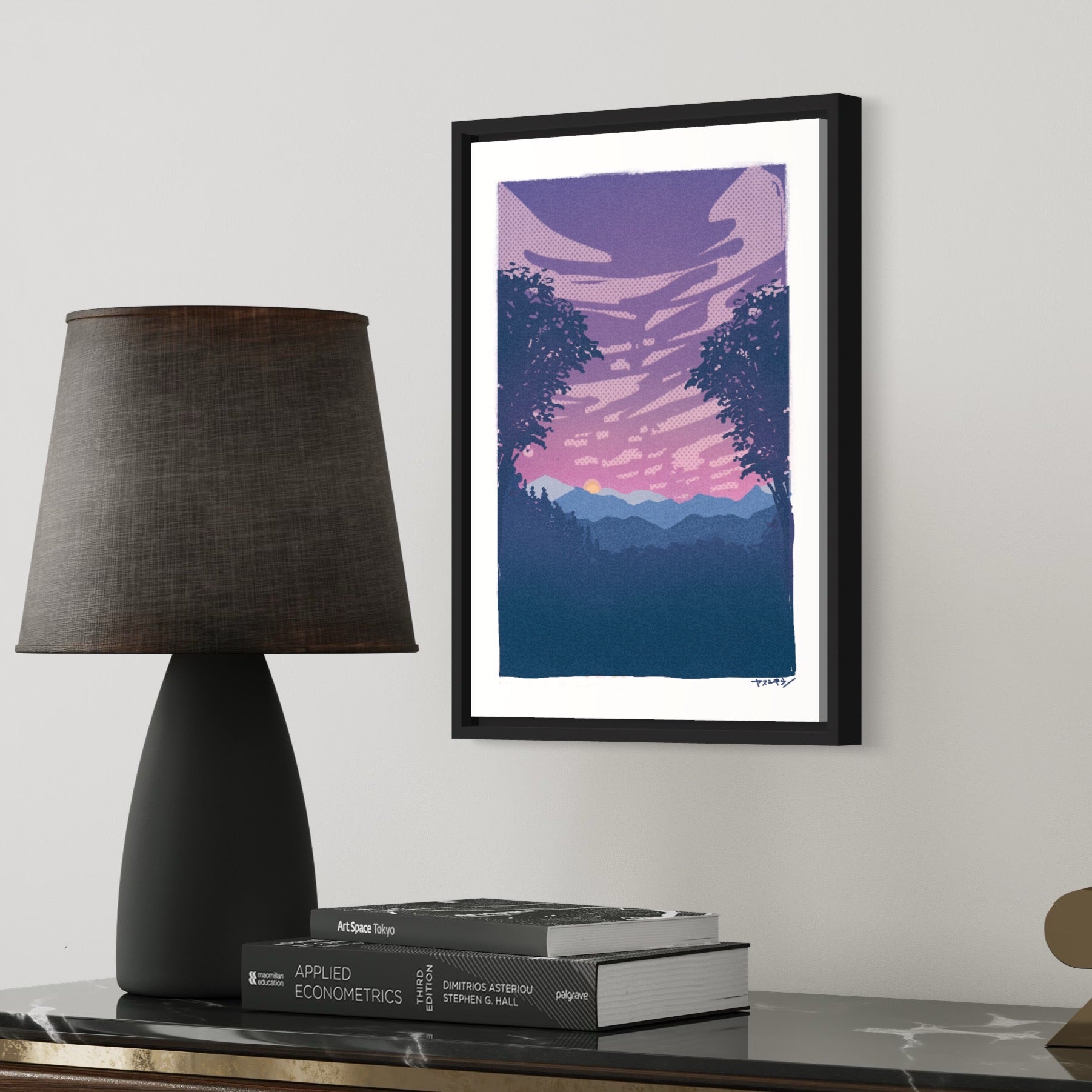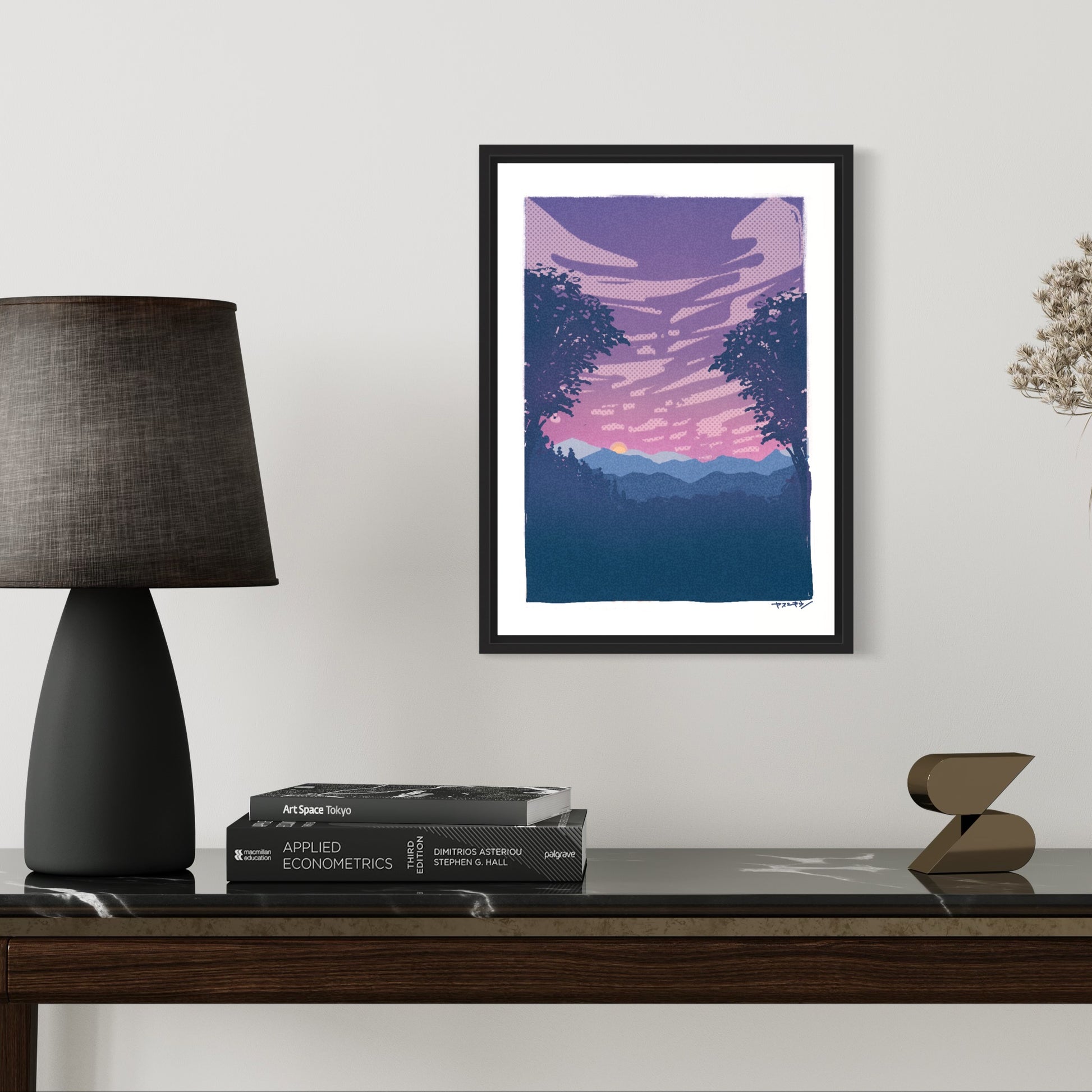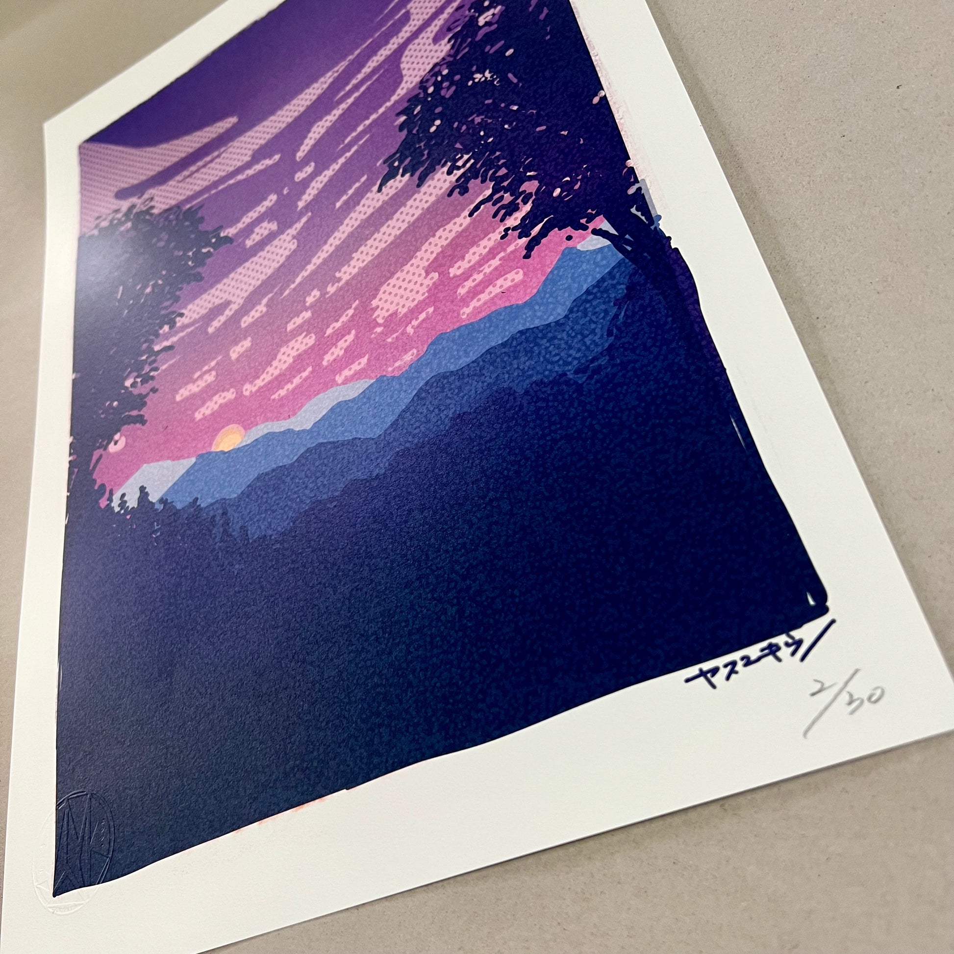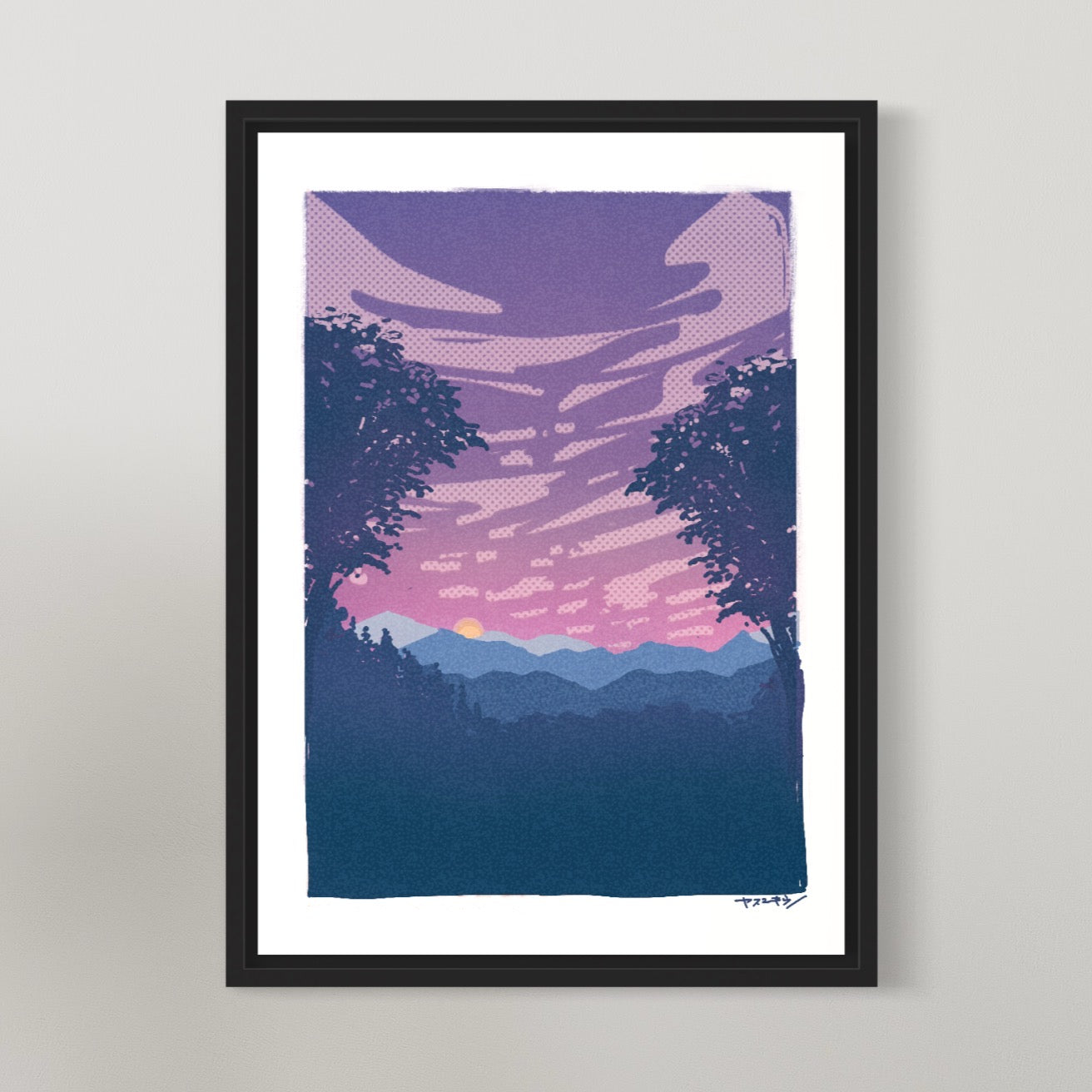 山々が連なる風景に日がしずみ赤く染まる時を版画っぽく少しアニメっぽく描いた作品