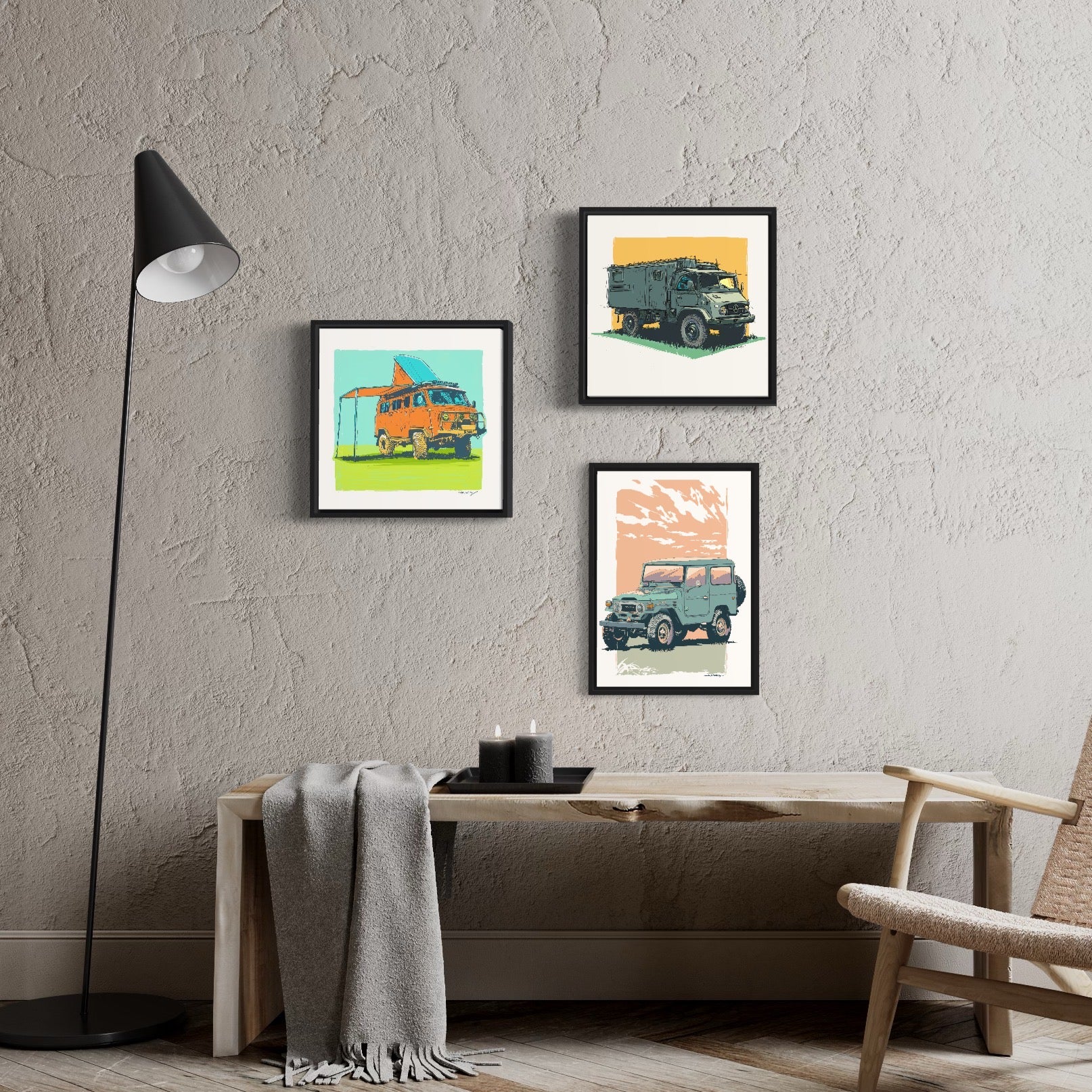 グリーンの芝生に映えるオレンジ色の少し丸っこく愛らしい4x4。昨今の日本車には無い無骨ながらつるんとしたフォルムがかわいらしくカッコいいと思って描いた作品
