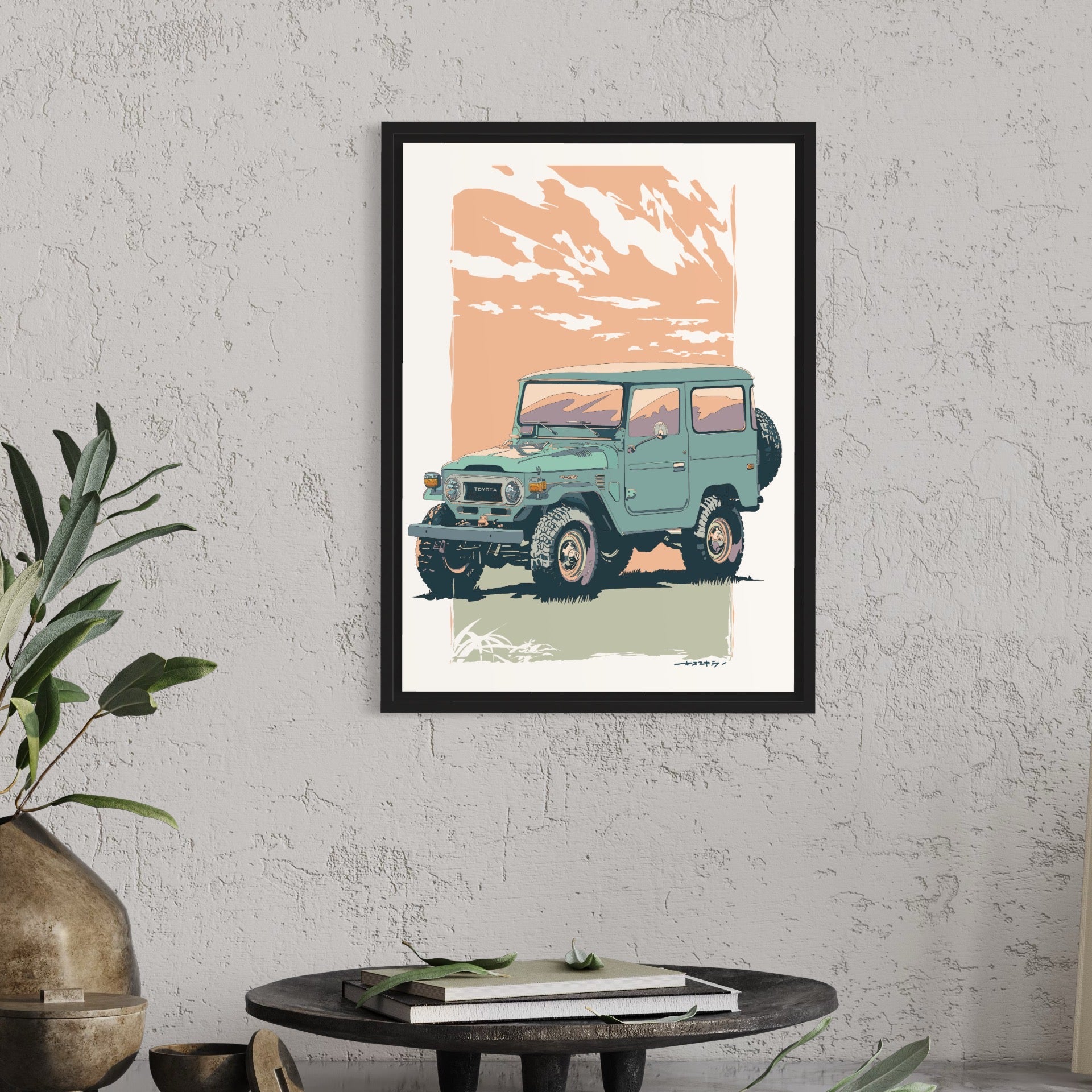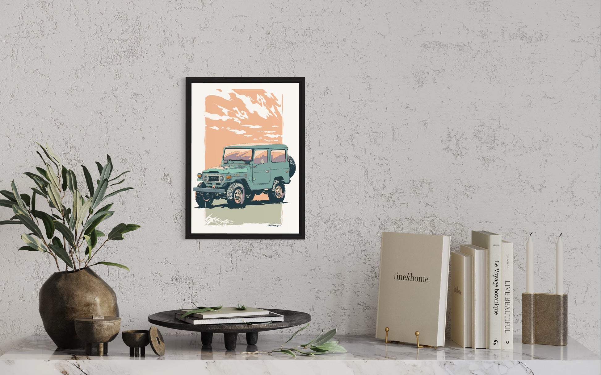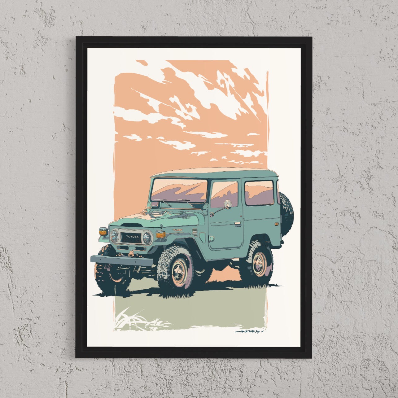 TOYOTAが誇る4x4の最高峰。シンプルなデザインの中にオフロードな無骨さが残るランクル40。実走行できるランクル40がどんどん減りつつある中、せめて絵で残したい、絵で持ちたいと思いながら描いた作品